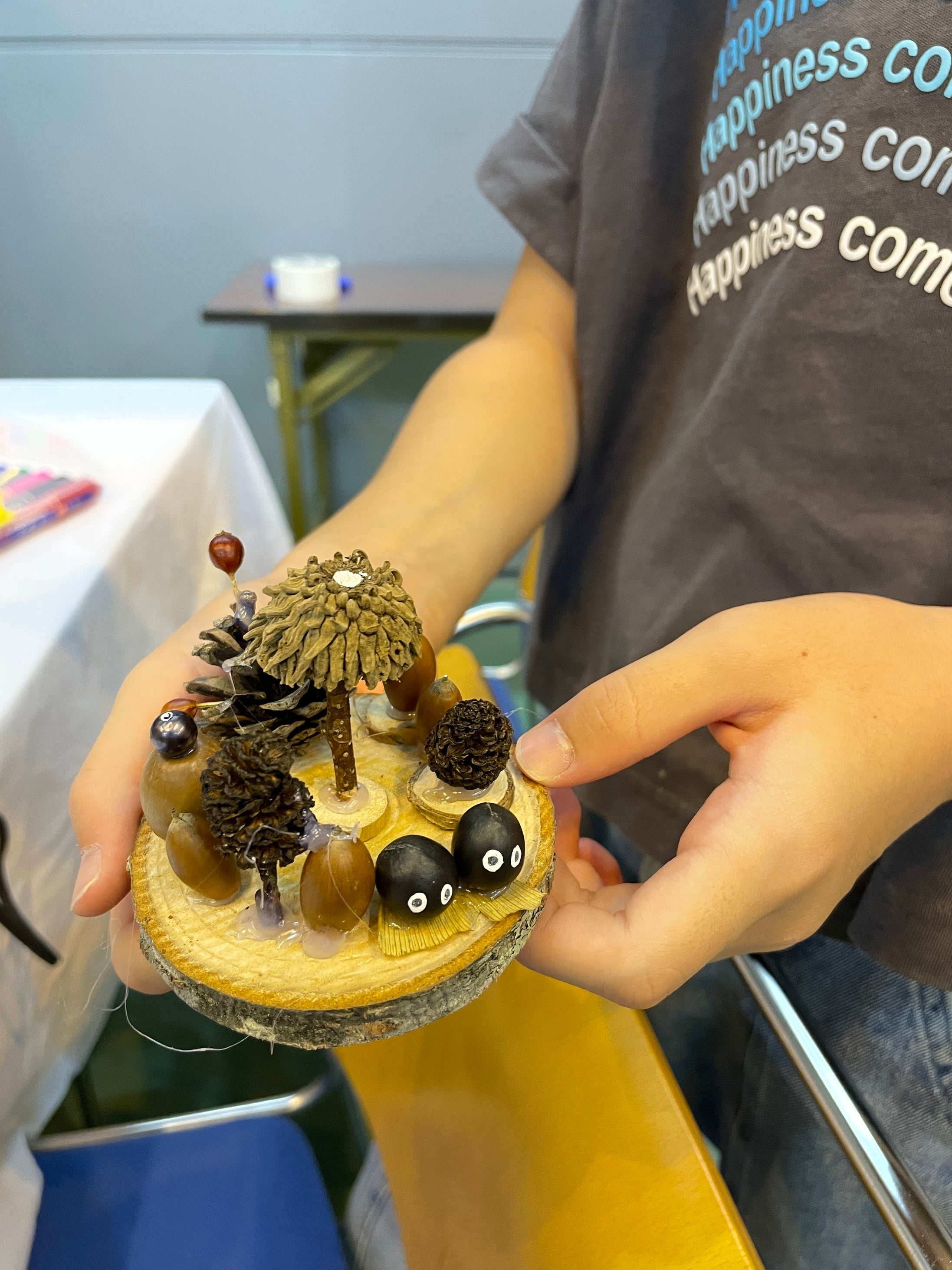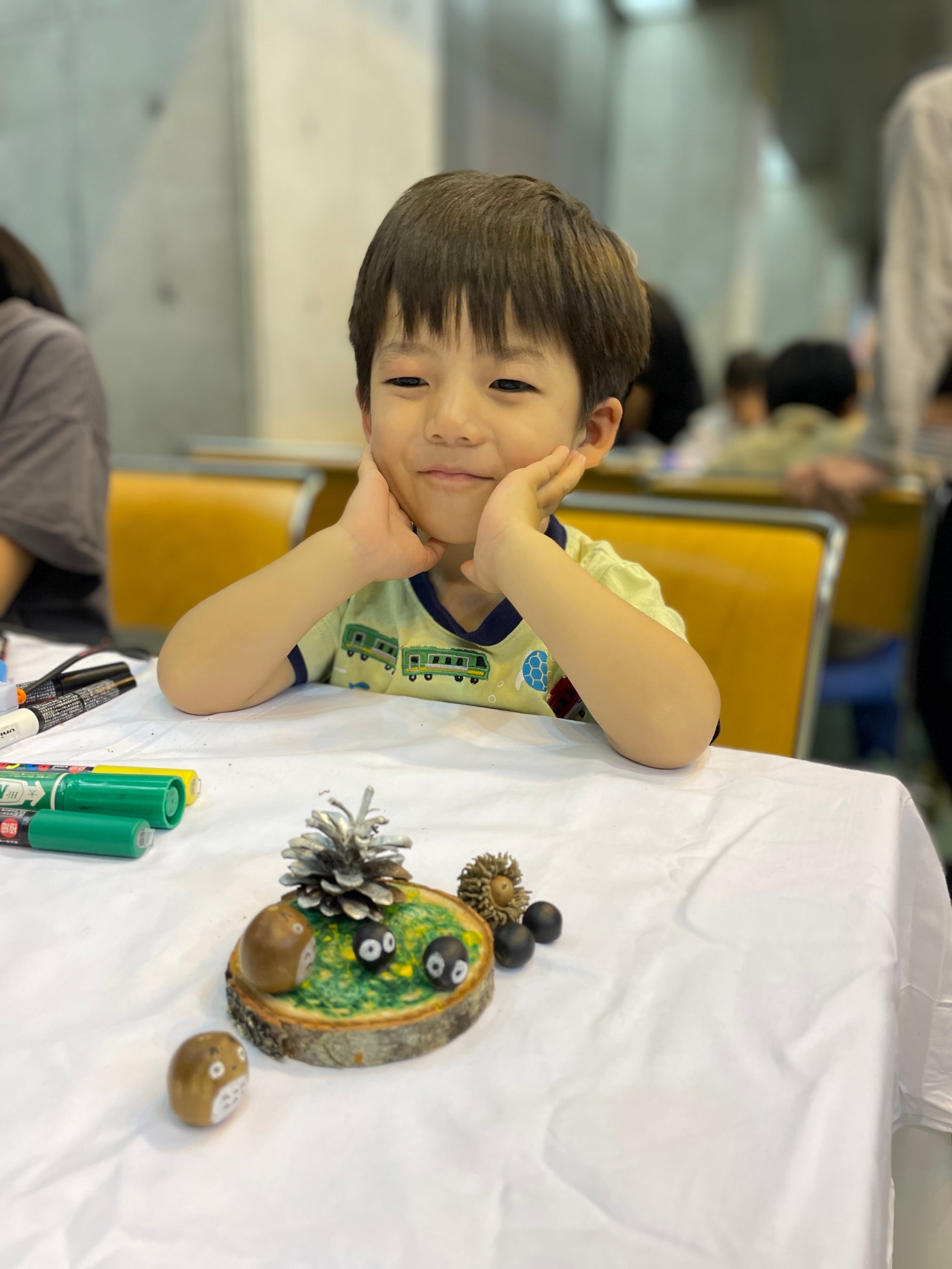 普段同様のクラフトをする際は、ビーズや綿、スパンコールなどのカラフルな材料を提供することもありますが、今回はあえて自然のもの(松ぼっくり、クルミの実、落ち葉、どんぐり、小枝など)のみを材料として提供しました。
