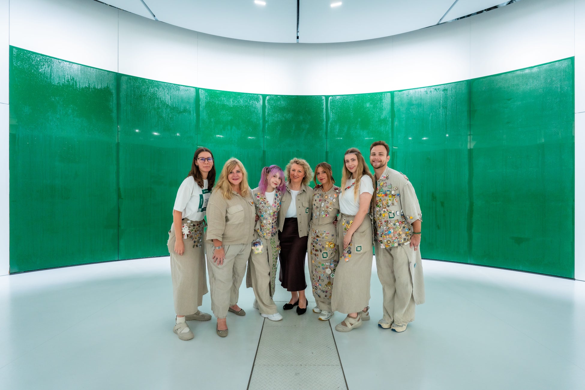 バルトパビリオンのスタッフユニフォームは、100%天然リネンを使用し、ラトビアとリトアニアの文化遺産と現代的な実用性を融合させたハンドメイドデザインが特徴です。天然素材を使用したサステナブルな設計、スタッフの快適性、そしてパビリオンのテーマを反映したナチュラルで洗練されたデザイン性が高く評価され、審査員から第1位を受賞しました。デザインはパンツ、ショーツ、スカート、ベスト、長袖シャツ、Tシャツなどから自由に組み合わせられるカプセルワードローブ形式になっており、スタッフ一人ひとりが自分のスタイルに合わせて着用できるよう工夫されています。ユニフォームの象徴であるナチュラルリネンのエプロンには、パビリオンのロゴ「We Are One」がグリーンであしらわれ、バルト地域の一体感を表現しています。さらに、このユニフォームを着用したスタッフによるプロフェッショナルで温かいおもてなしも来場者から絶賛され、パビリオン全体の魅力をさらに引き立てました。