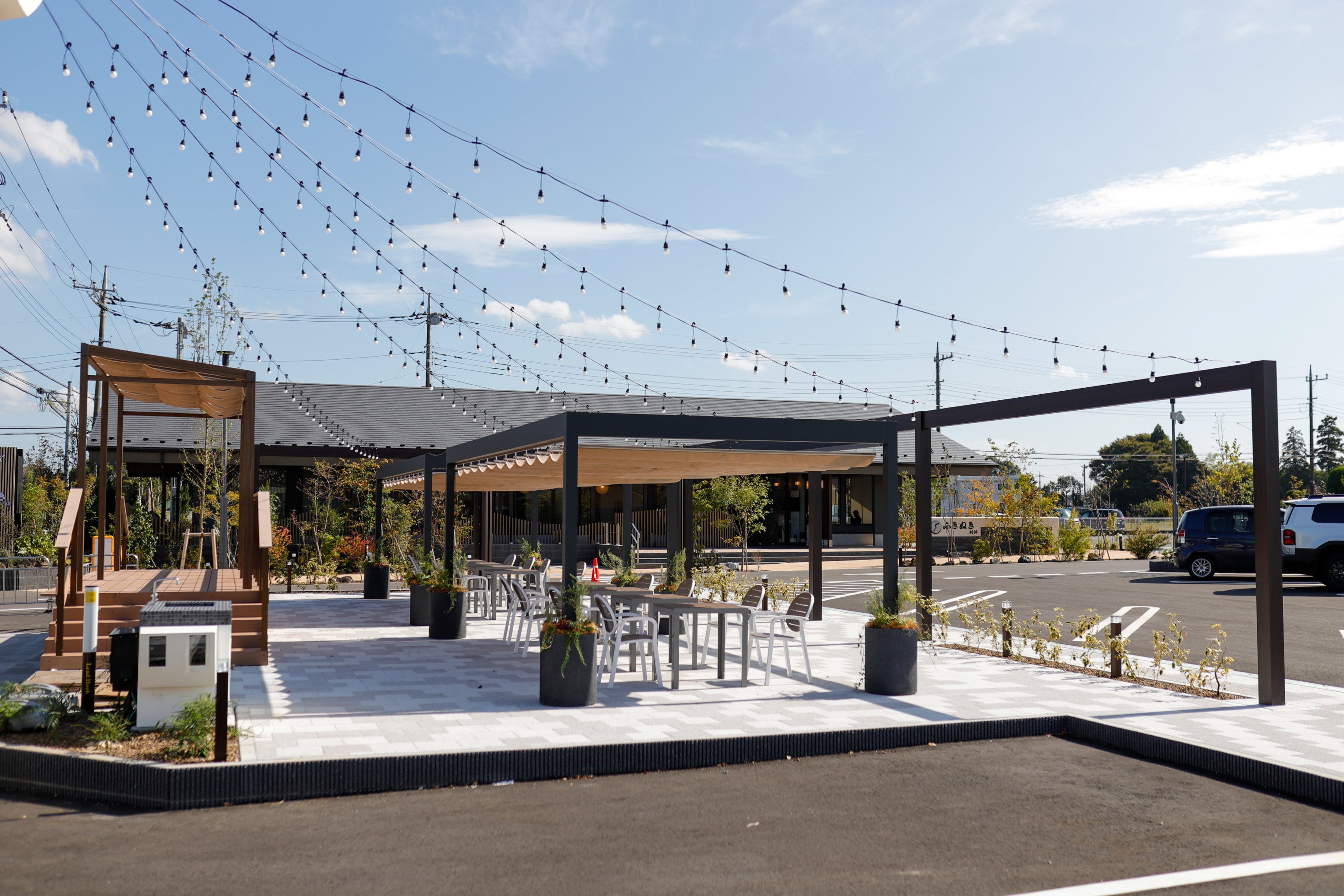 開放的なイートインスペース:開放的でデザイン性の高いテラス席を完備。昼夜問わず、心地よい風を感じながら、ゆったりとした時間をお過ごしいただけます。