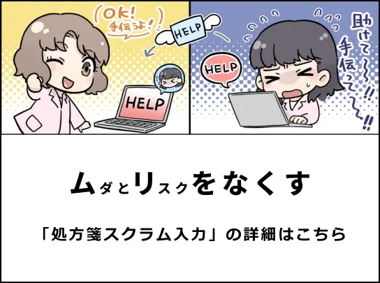 処方箋スクラム入力は、薬局チェーン間で処方箋入力をリモート支援できる仕組みを構築し、急な欠勤や移動負担の軽減に対応できます。