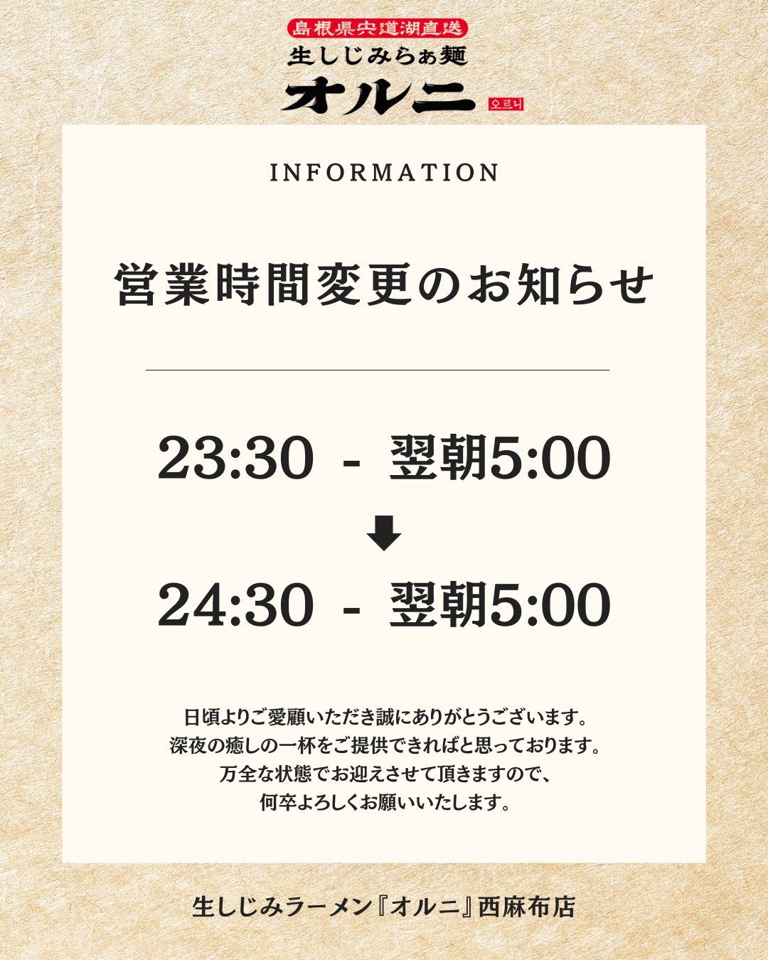 オルニ株式会社(本社:東京都渋谷区、代表取締役:熊崎雅崇)は、2025年4月より『生しじみラーメン オルニ 西麻布店』の営業時間を変更し、これまでより1時間遅い24:30から翌朝5:00までの営業といたしました。