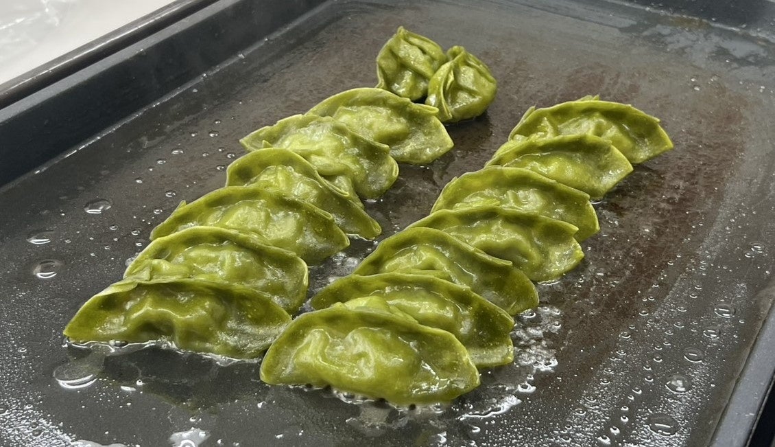 多摩大学松本ゼミとわさび食堂が共同開発した奥多摩産わさびパウダーを練り込んだ皮で、奥多