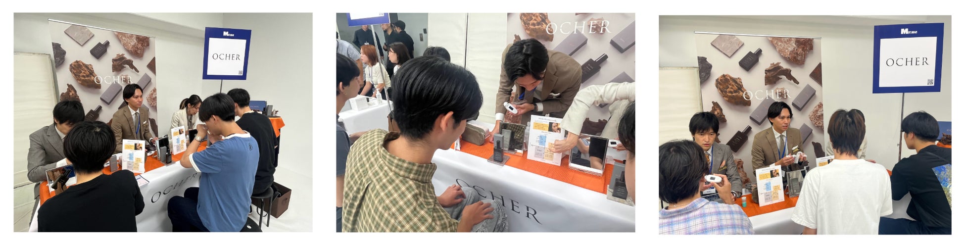 オーカーは2日間開催のうち、9/14(日)に体験ブースを出展いたしました。ブランドや製品の特徴などについて紹介し、参加者の方に肌診断を行いました。オーカーが男性肌の正解として定義をしている「セミマット肌」に近づくため、自身の肌の水分量を可視化することにより、参加者の方にも「OCHER THE SERUM」使用前後での効果をその場で実感していただきました。