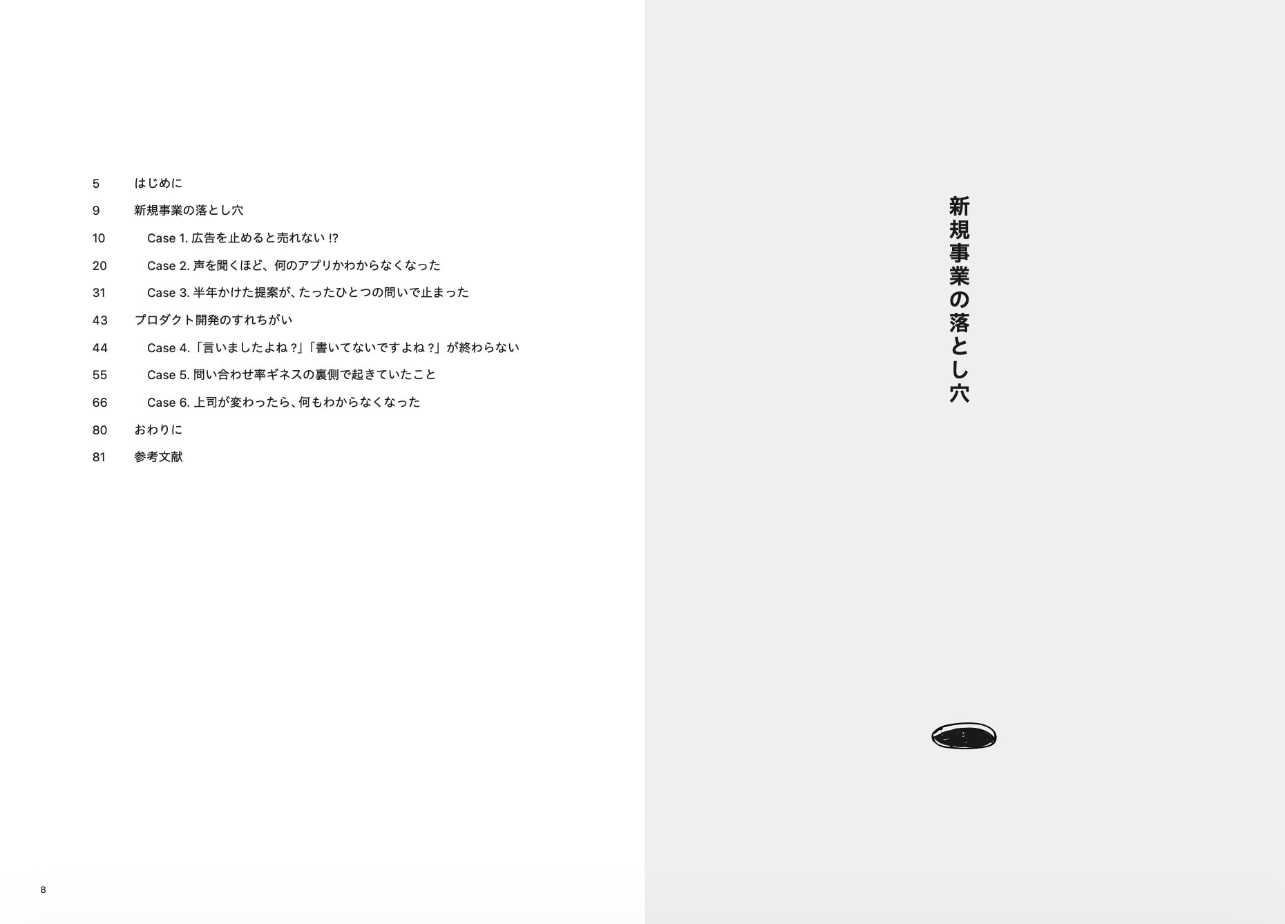 本書には6つのケースが収められています。前半3つは「新規事業の落とし穴」、後半3つは「プロダクト開発のすれちがい」を扱います。