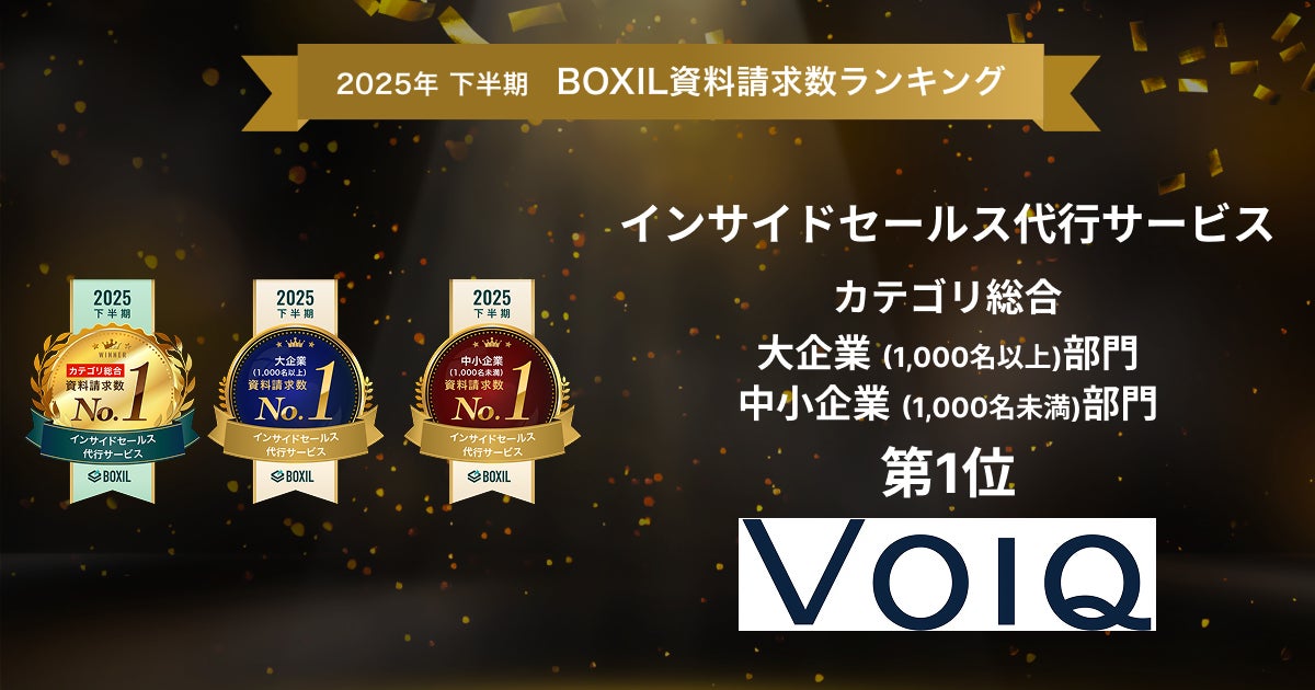 VOIQ株式会社(本社:東京都港区、代表取締役:高田 恵、以下 VOIQ)が提供する「VOIQのインサイドセールス支援」 は、スマートキャンプ株式会社(以下「スマートキャンプ」)が主催する「2025年下半期 BOXIL資料請求数ランキング」のインサイドセールス代行サービスカテゴリにおいて、総合1位・大企業部門/中小企業部門1位に選出されました。大企業部門1位は、同カテゴリにおいて、対象期間内に大企業(1,000名以上)に所属するユーザーからの資料請求数が最も多かったサービス、また中小企業部門1位は同カテゴリにおいて、対象期間内に中小企業(1,000名以下)に所属するユーザーからの資料請求数が最も多かったサービスとして、選出されたものです。
