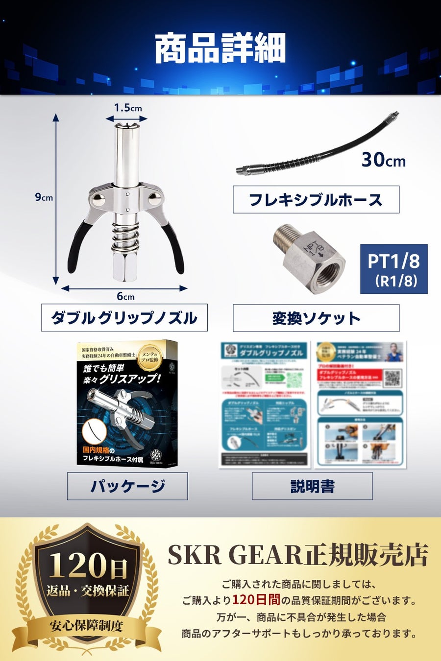 セット内容:ダブルグリップノズル、フレキシブルホース(30 cm)、PT1/8 変換ソケット、取扱説明書