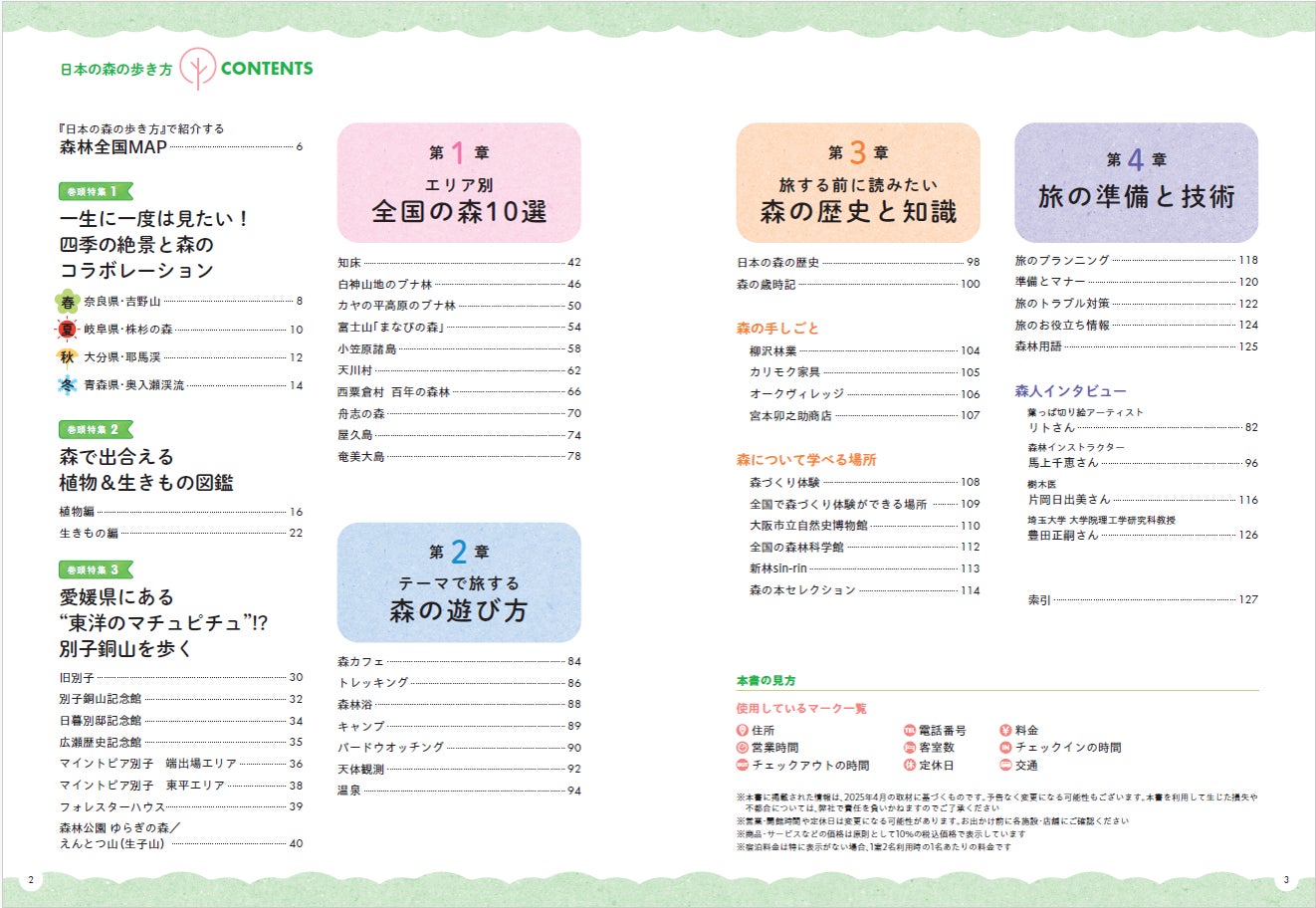 本書では、住友グループゆかりの別子銅山の歴史から紐解く、人と森との共生の学びを紹介。四季折々の日本各地の美しい森の姿、知床や白神山地などの全国の森をめぐる観光モデルプラン、アウトドア初心者から上級者まで楽しめる森の遊び方ガイドなどが収録され、観光ガイドとしてだけでなく教養書としても読み応えのある一冊となっています。
