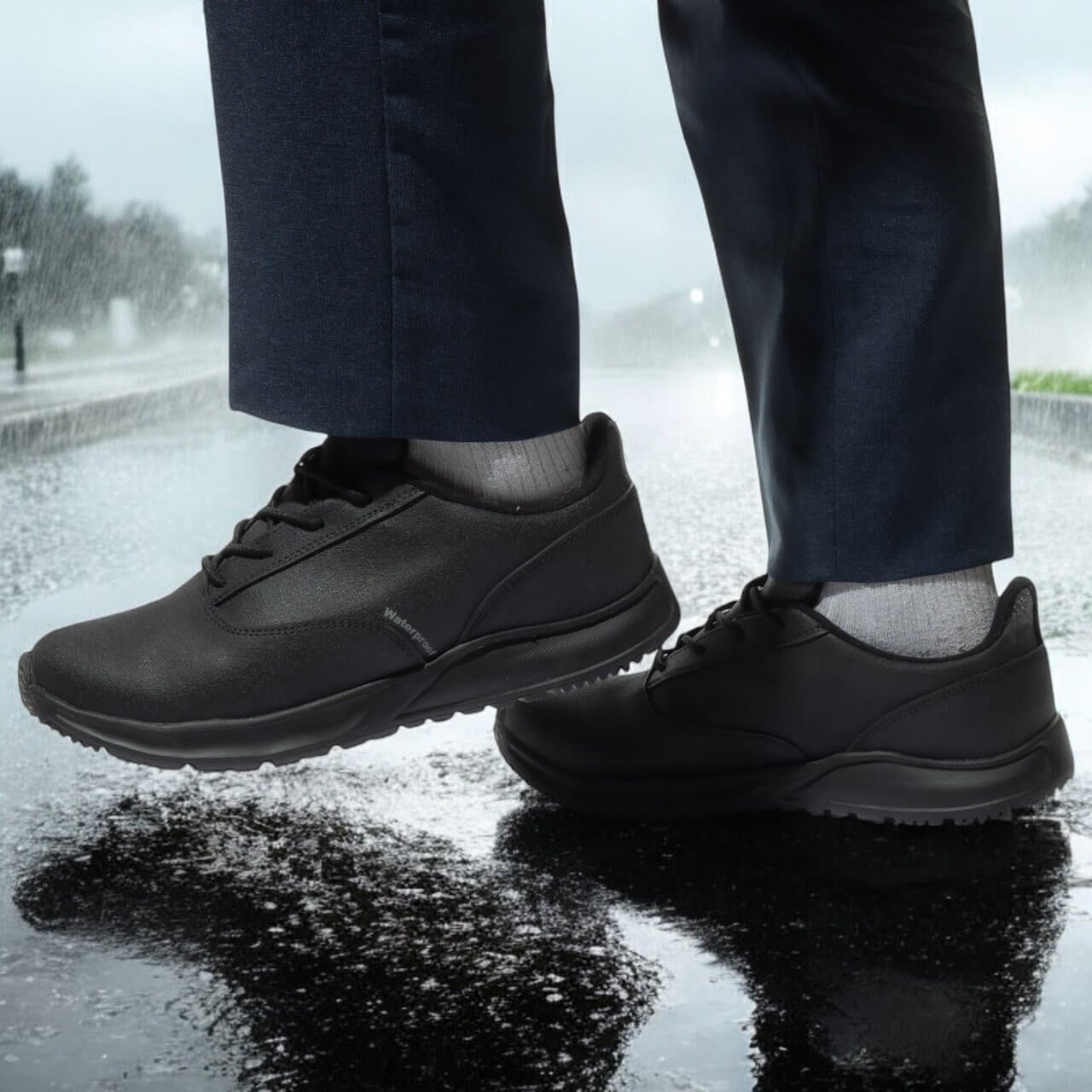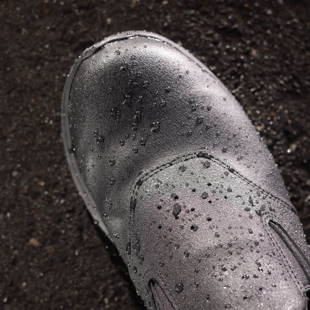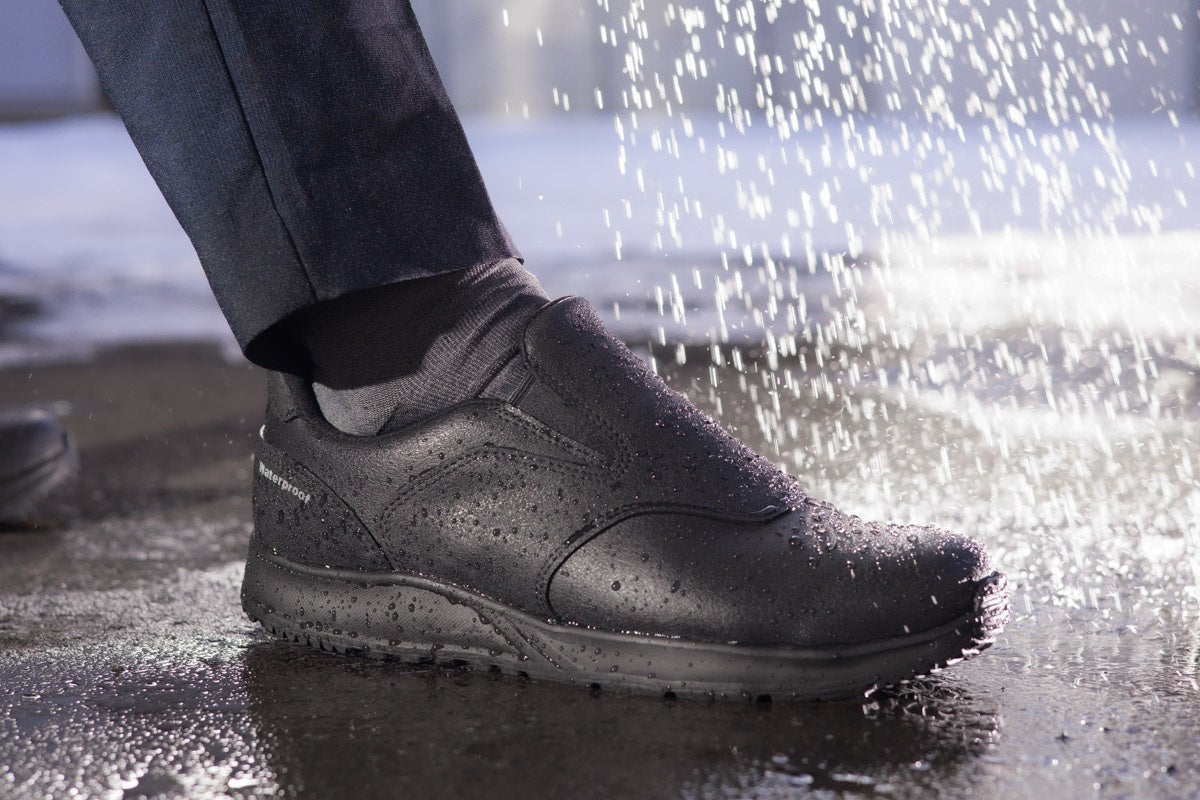 雨の日の外回り営業や会社への往復に適した防水アッパー、さらに飲食店や水回りに近い職場でも安心な防滑ソールを採用し、国際特許素材使用のアウトソールで転倒事故を防ぐビジネスシューズです。