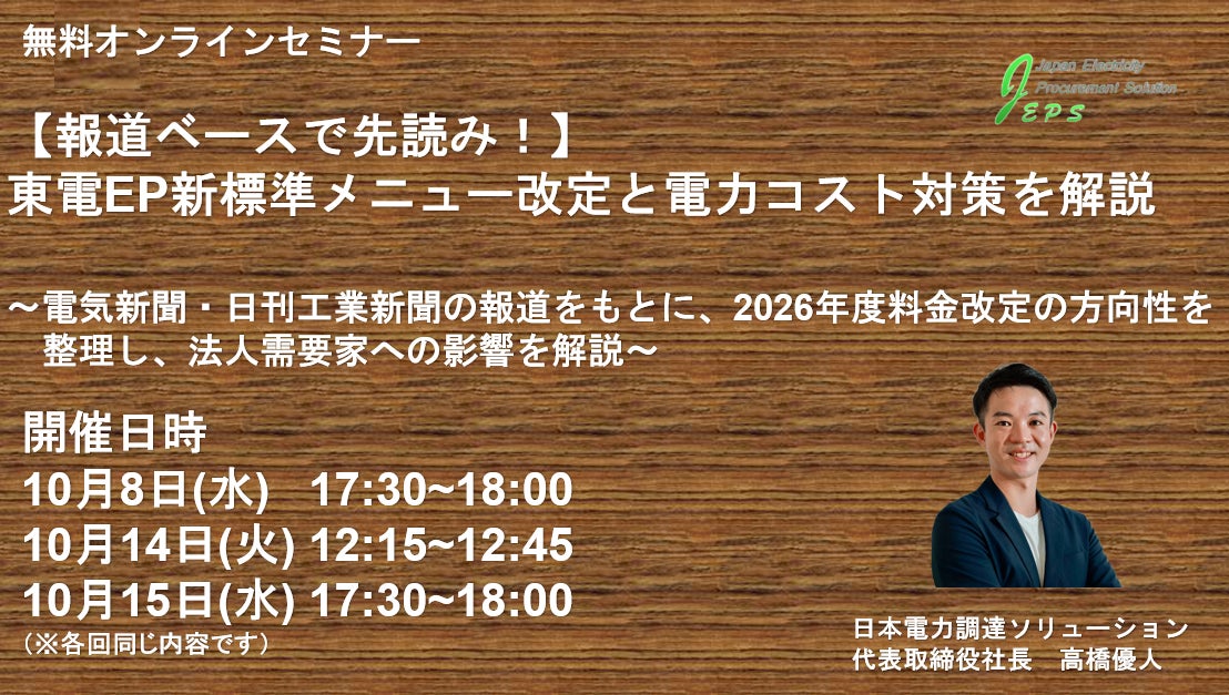 法人向けに電力契約・再エネ調達支援を行う 株式会社日本電力調達ソリューション(本社:東京都港区、代表取締役社長:高橋優人、以下「当社」)は、報道ベースで注目されている東京電力エナジーパートナー(東電EP)の新標準メニュー料金改定をテーマにした無料オンラインセミナーを開催いたします。