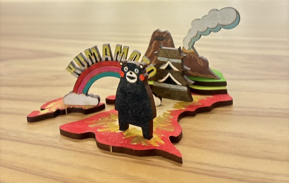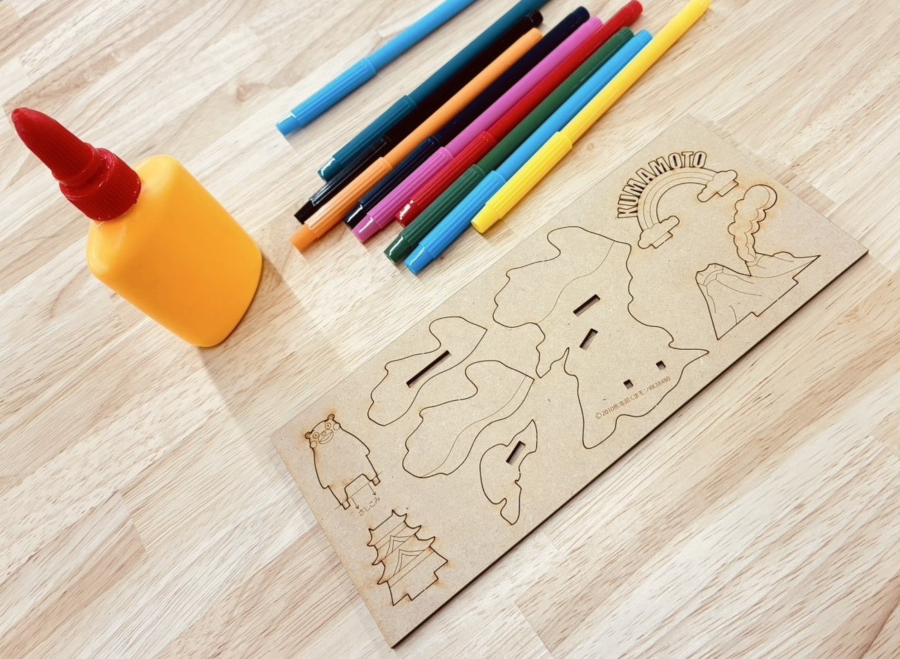 クラフトキットは、「くまモン」と観光名所の「熊本城」と「阿蘇山」が県の形の台座に乗るミニディスプレイです。パーツ素材は、廃材を細かく粉砕して板状に成型した木板を使用し、規定カラーの「くまモン」以外は、参加者が自由な発想で各パーツの色付けができます。