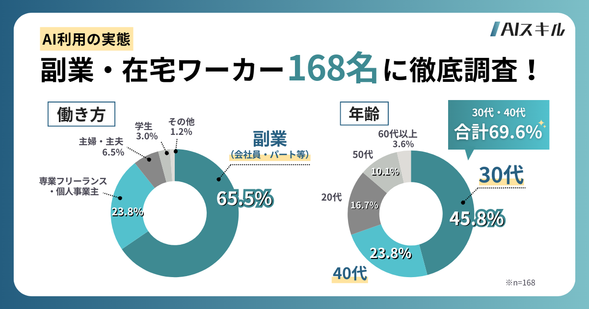 累計セミナー予約者数10万人以上の「最新AI活用セミナー」を提供するAIスキルアカデミー(運営:株式会社AIスキル)は、副業・在宅ワークを行う168名を対象に「生成AI導入後のWebの業務や報酬の変化」についてアンケート調査を実施しました。