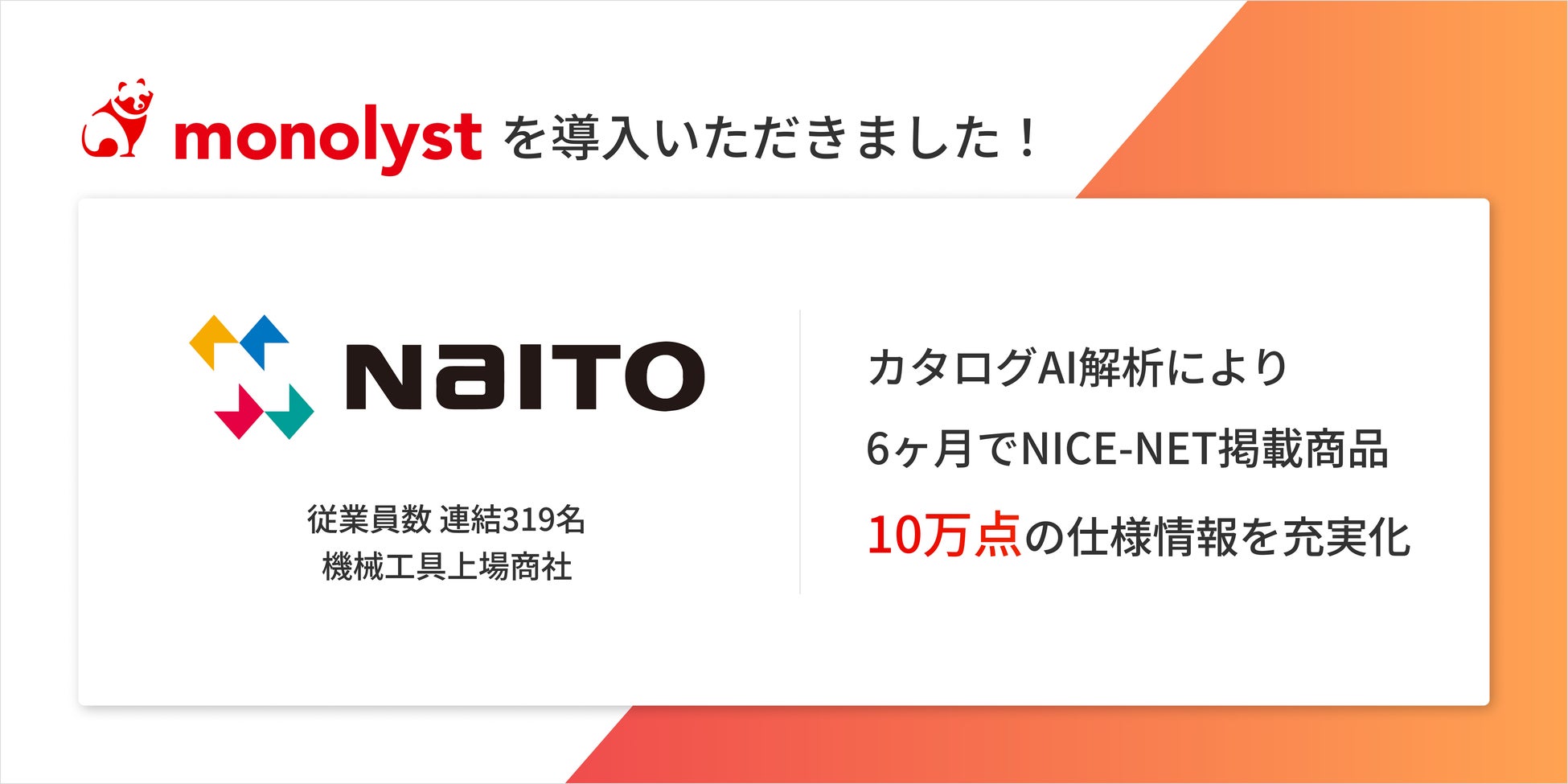 monolyst株式会社(本社:東京都渋谷区、代表取締役:伊関 洋介)が運営する転記レス商品情報管理システム「monolyst(モノリスト)」は、機械工具上場商社の株式会社NaITO(本社:東京都台東区、取締役社長:坂井 俊司)に導入されたことをお知らせします。