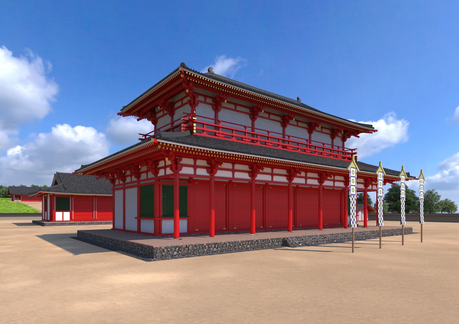 ・復元CG画像は、武蔵国分寺伽藍復元模型設計書や武蔵国分寺七重塔復元模型設計書、国指定史跡武蔵国分僧寺跡発掘調査報告書を基に、学芸員の監修を経て制作しています。史料等当時の記録がない部分の再現は一部イメージも含みます。