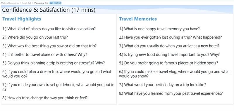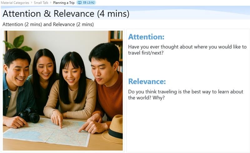 レッスン冒頭では学習者の『注意』を引く質問(例:「最初に(あるいは次に)旅行したい場所を考えたことはありますか?」)といった身近な話題からスタートします。
