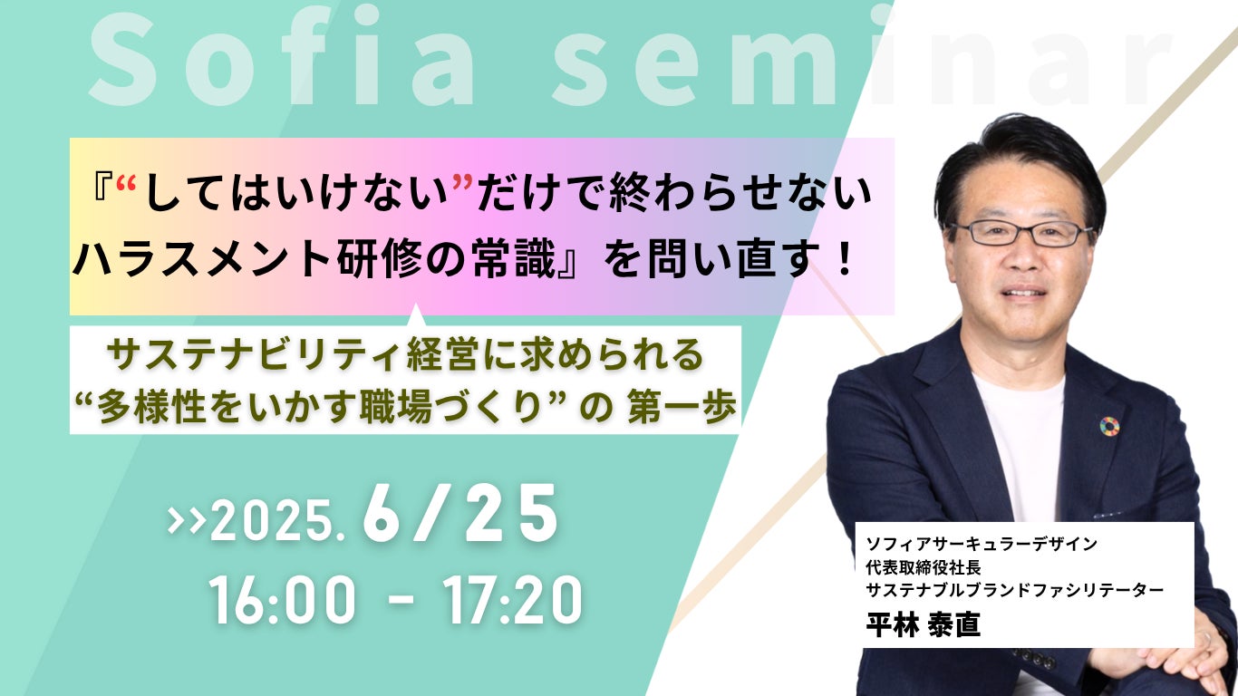 株式会社ソフィア(東京都港区麻布十番、代表取締役:廣田 拓也、以下ソフィア)は"してはいけない”だけで終わらせないハラスメント研修の常識を問い直す〜サステナビリティ経営に求められる“多様性をいかす職場づくり”の第一歩〜と題し、無料セミナーを開催します。