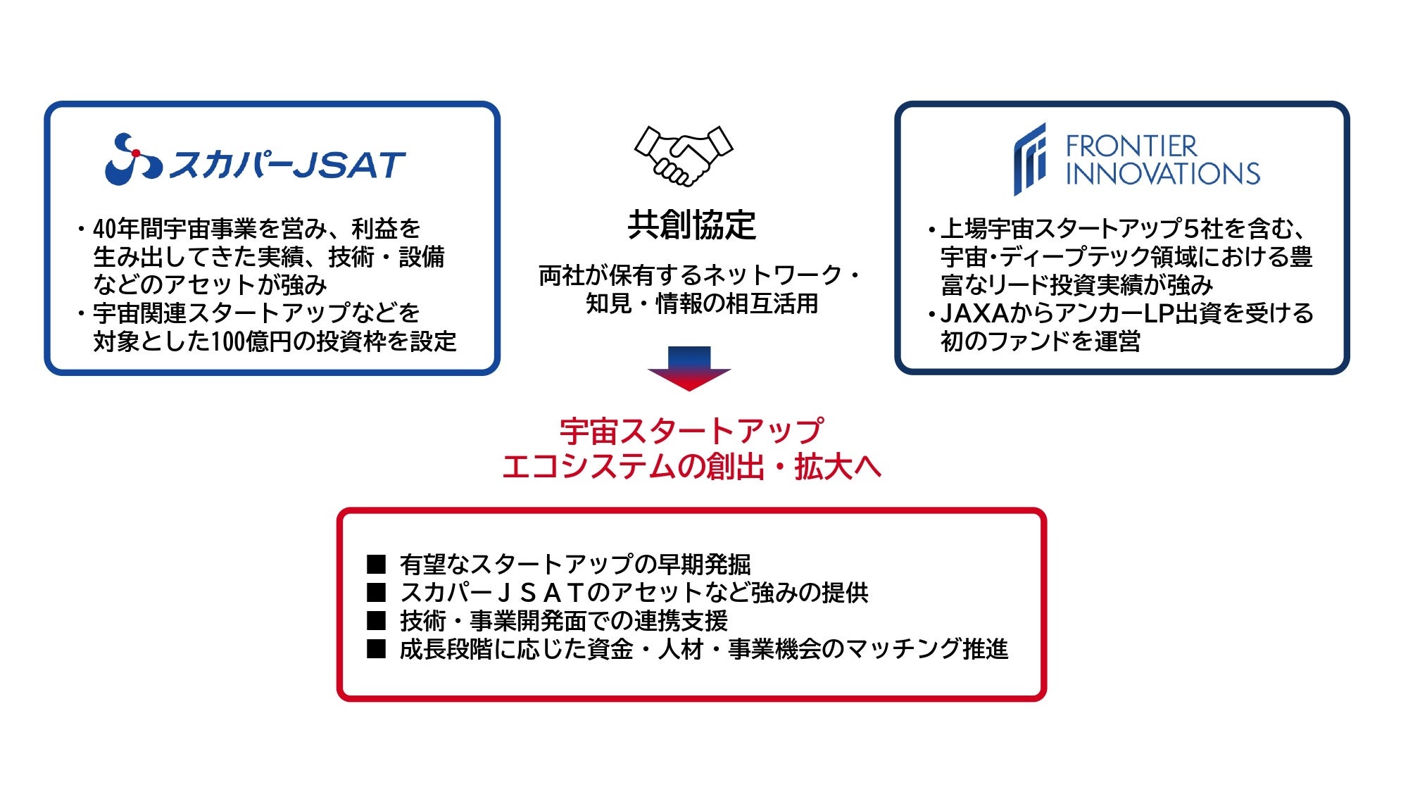 スカパーJSAT株式会社(本社:東京都港区、代表取締役 執行役員社長:米倉 英一、以下「スカパーJSAT」)とFrontier Innovations株式会社(本社:東京都中央区、代表取締役社長:西村 竜彦、以下「Frontier Innovations」)は、本日発表したスカパーJSATによる「Frontier Innovations 1号投資事業有限責任組合へのLP出資」に加えて宇宙スタートアップエコシステムの共創に関する協定(以下「共創協定」)を締結したことをお知らせします。この協定により、両社が保有する、ネットワーク・知見・情報を相互に活用することで、資金提供だけでなく、有望なスタートアップの早期発掘をはじめ、技術・事業面での伴走支援、草創期からの育成を通じたスタートアップエコシステムの創出と拡大を実現します。