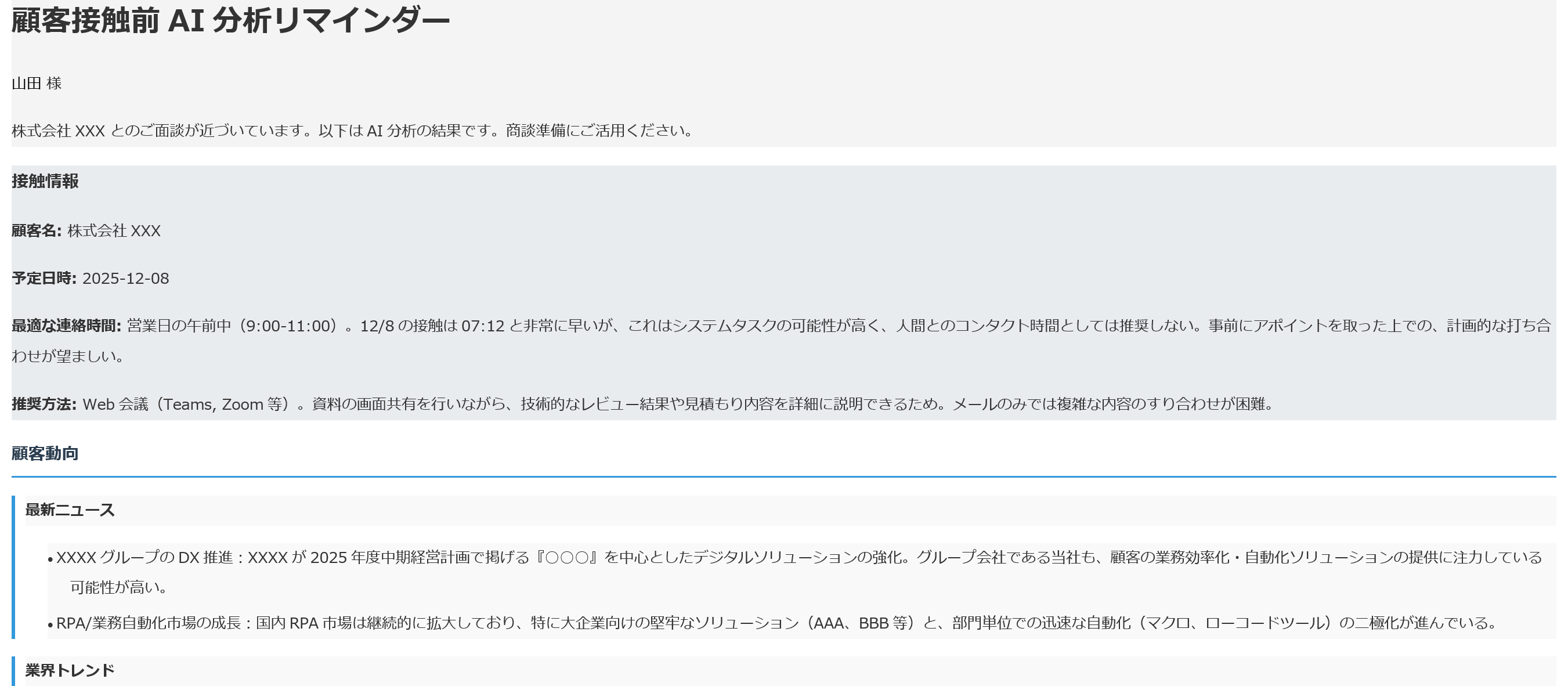 訪問・Web会議・見積提案などの前に、接触履歴・顧客情報・業界ニュース・トレンドをAIが解析し、