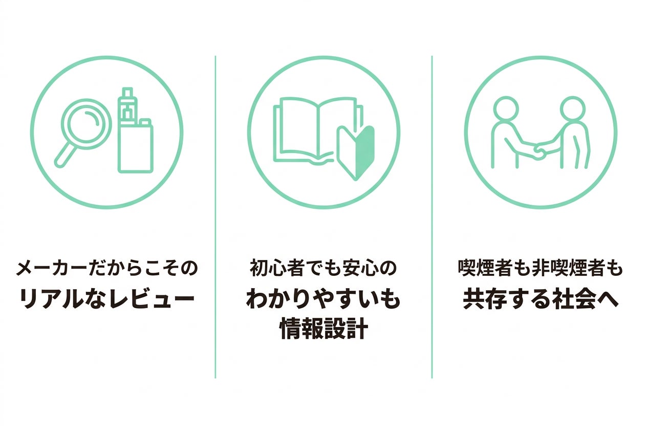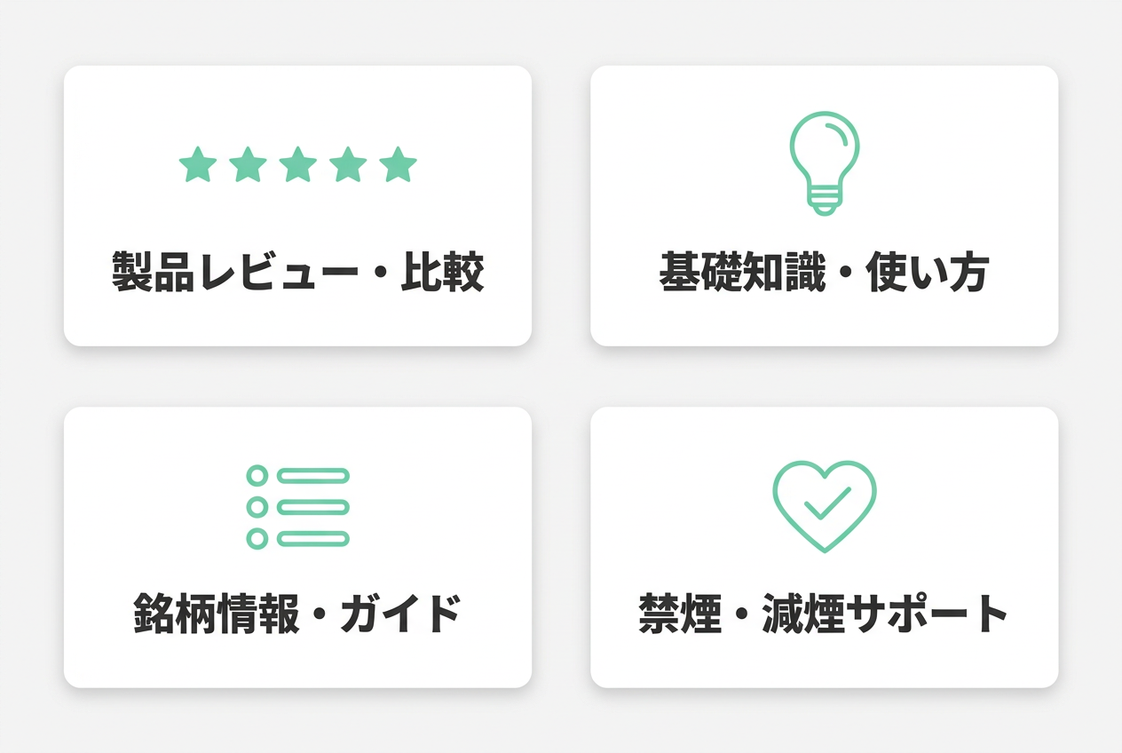「電子タバコとは何か」「加熱式タバコとの違い」「はじめての1台の選び方」など、基礎知識から製品選びまでを体系的に解説するコンテンツを充実させています。専門用語にはわかりやすい説明を添え、初めて電子タバコに触れる方でも安心して情報を得られるメディアを目指しています。