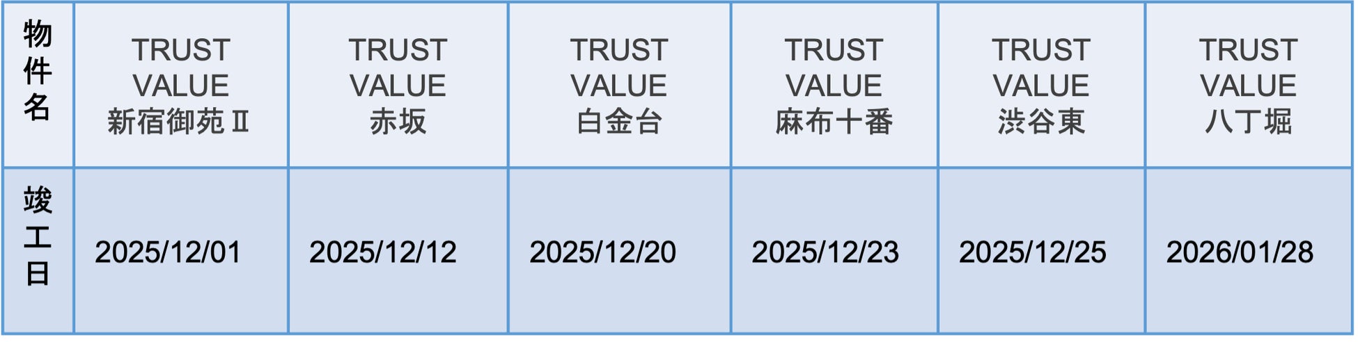 今回展開する6物件は、 「TRUST VALUE 白金台」 「TRUST VALUE 赤坂」「TRUST VALUE 新宿御苑Ⅱ」「TRUST VALUE 麻布十番」「TRUST VALUE 渋谷東」「TRUST VALUE 八丁堀」で構成されており、港区、新宿区、渋谷区、中央区といった東京の中心地で、順次再生・展開を進めてまいります。