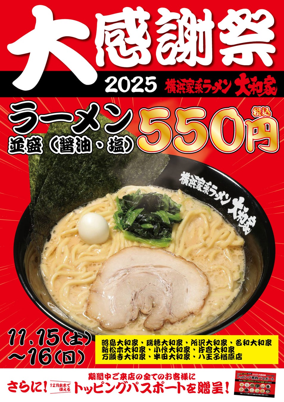 株式会社AZism(本社:東京都八王子市、代表取締役 和田 敏典)が展開する「横浜家系ラーメン大和家」は、日頃のご愛顧への感謝を込めて、2025年11月7日(金)・8日(土)の2日間と2025年11月7日(金)・8日(土)の2日間で「大感謝祭2025」を開催いたします。期間中は、当店人気の「ラーメン(並盛・醤油/塩)」を特別価格 税込550円 にてご提供いたします。