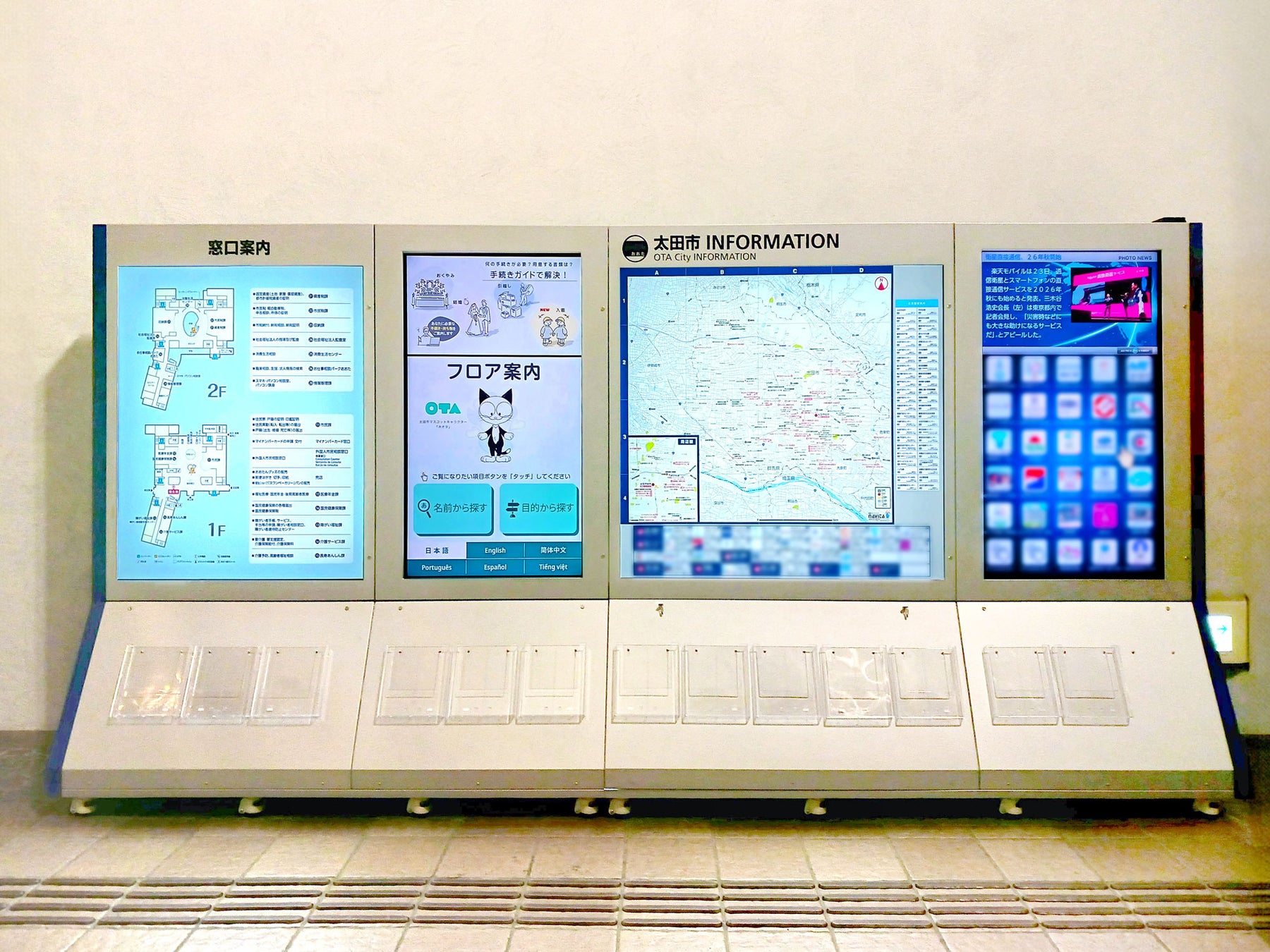 また、太田市内に在住する外国人の方にも利用しやすいよう、本案内板のタッチ式操作は多言語に対応しており、日本語、英語、中国語に加え、スペイン語、ポルトガル語、ベトナム語を採用しています。 デジタルサイネージのトップ画面には太田市のマスコットキャラクター「おおたん」と、20周年を記念して誕生した「ネオタ」が時間帯に応じて交互に登場することで、親しみやすさと地域への愛着を表現し、庁舎に訪れる人々に温かみのある印象を与えています。