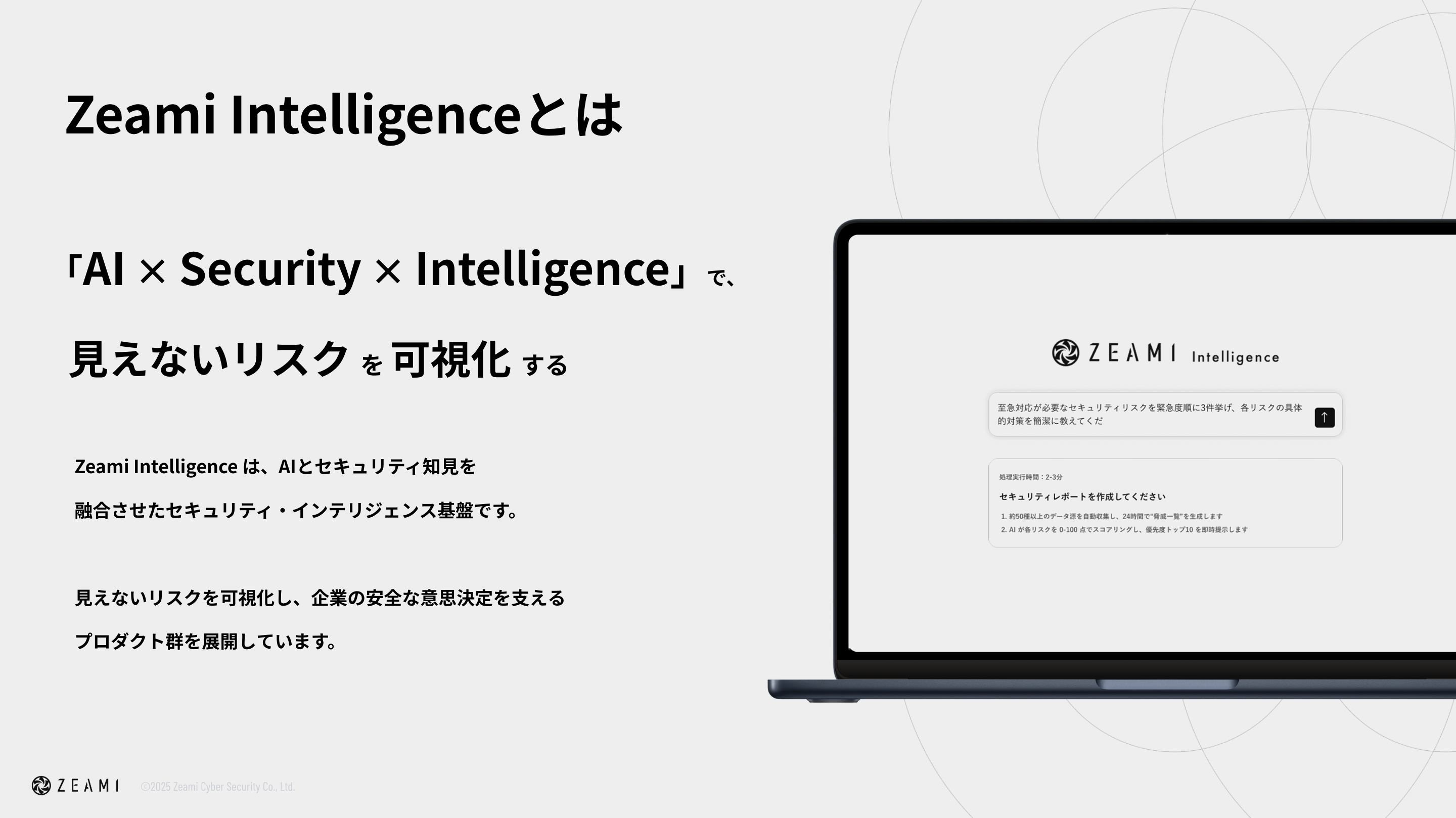 インテリジェンスベースのセキュリティ製品を開発・提供するZeamiCyberSecurity株式会社(本社:東京都中央区、代表取締役:大井 翔、以下「当社」)は、次世代のセキュリティ・インテリジェンス基盤「Zeami Intelligence」を新たに公開いたしました。