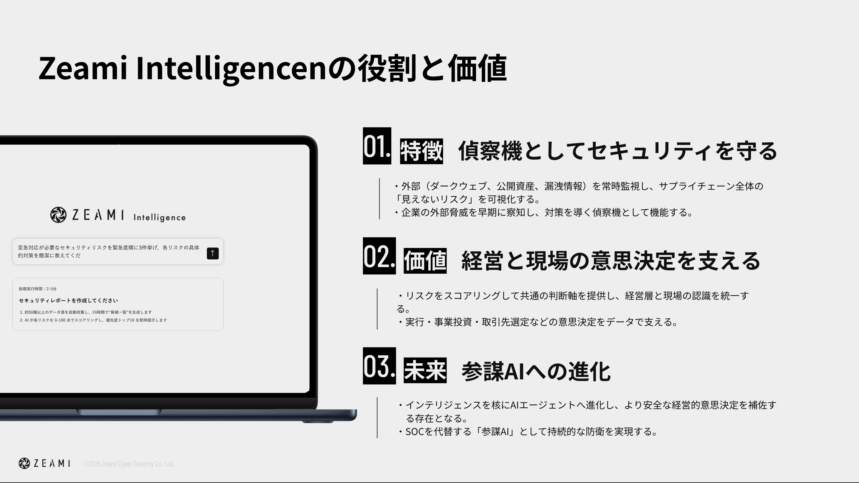 Zeami Intelligenceの技術基盤を活用したプロダクト群として、第三者リスク管理(TPRM)を皮切りに、攻撃面管理(ASM)、高度情報解析(DeepInsight)、など、複数の領域への展開を順次予定しています。