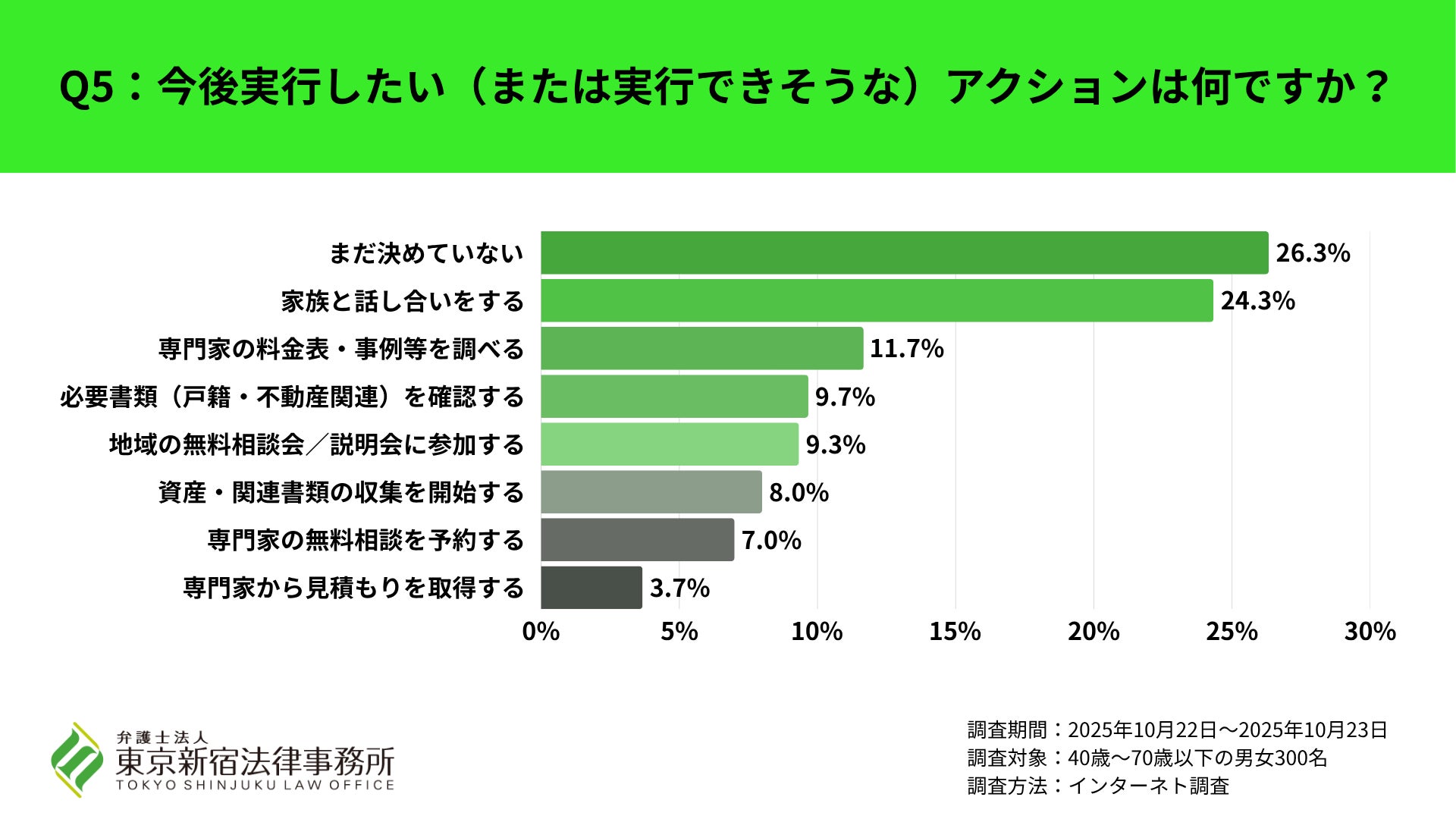 直近のアクションは「まだ決めていない」26.3%、「家族と話し合い」24.3%