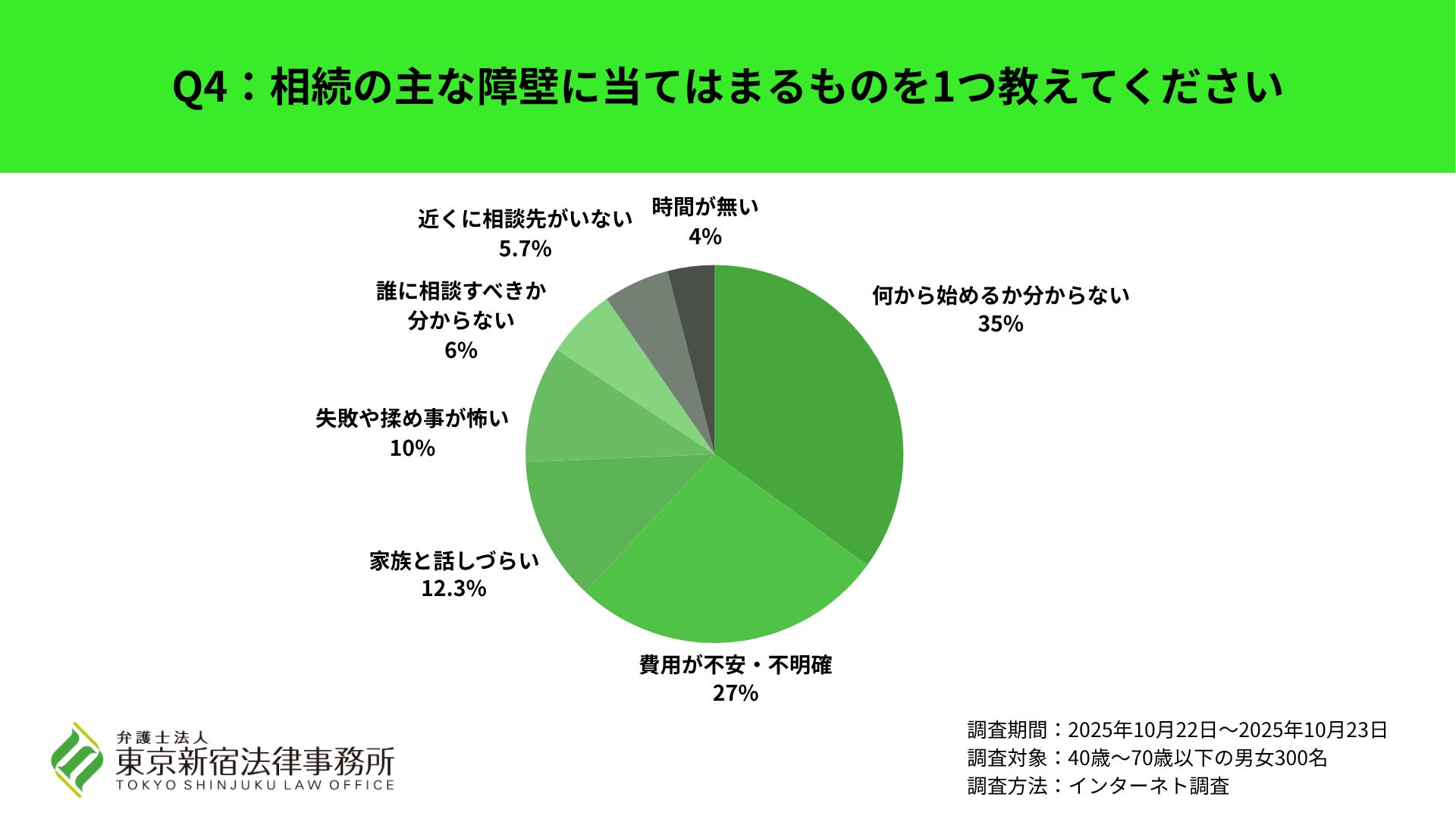 相続で感じる不安・障壁は「何から始めるか分からない」35.0%が最多で、「費用が不安・不明確」27.0%、「家族と話しづらい」12.3%が続きます。初動の手順不明と費用面の不透明さが行動のブレーキになっている可能性があります。
