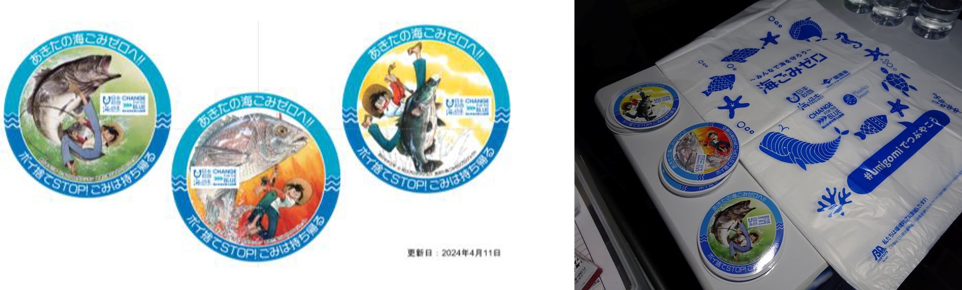 釣り場のごみ拾いや、ごみ抑制、釣り場のルールやマナーを再確認してもらう目的として作られた「釣りキチ三平ステッカー」が徐々に釣り人達の間に知れ渡り人気を集め始めています。今回の米代川サクラマスCUPでの清掃活動に協力してくれた方々にも配布し喜ばれました。三平オリジナルステッカーは、釣道具などに貼れるように防水性のあるステッカーとなっており、釣り場でステッカーを目にすることで、ポイ捨て禁止やごみ削減意識をもってもらうような仕掛けとなっています。6月以降には25年版ステッカー3種類も加わり、ステッカーは全12種類となります。