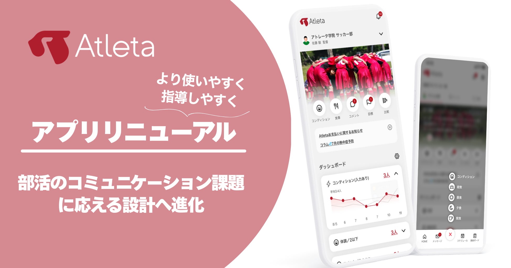 昨今「部活動の地域移行・展開」をはじめとした、スポーツ活動の在り方が盛んに議論されています。Atletaはスポーツを「支える人」と「する人」に向けたサービスとして、コンディション・食事・怪我・練習記録などの管理、それらのデータを用いたコミュニケーションをサポートしてまいりました。