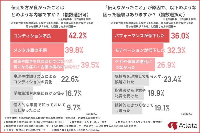 また、多くの場合、選手にとって「指導者に伝えるべきことを実際に伝えること」は難しく、適切なタイミングでのコミュニケーションの機会を逸したことがパフォーマンスやモチベーションの低下につながる経験をした、と回答しています。