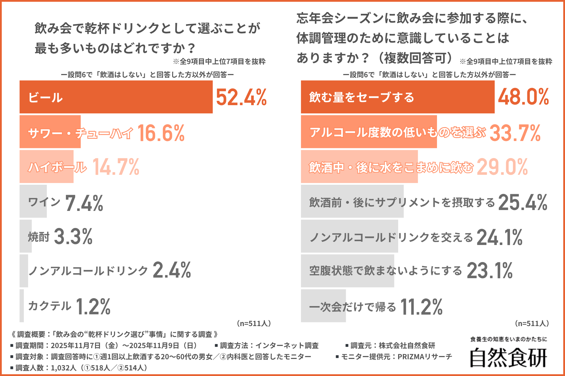 そこで今回、株式会社自然食研(https://www.sizenshokken.co.jp/)は、①週1回以上飲酒する20〜60代の男女/②内科医を対象に、「飲み会の“乾杯ドリンク選び”事情」に関する調査を行いました。