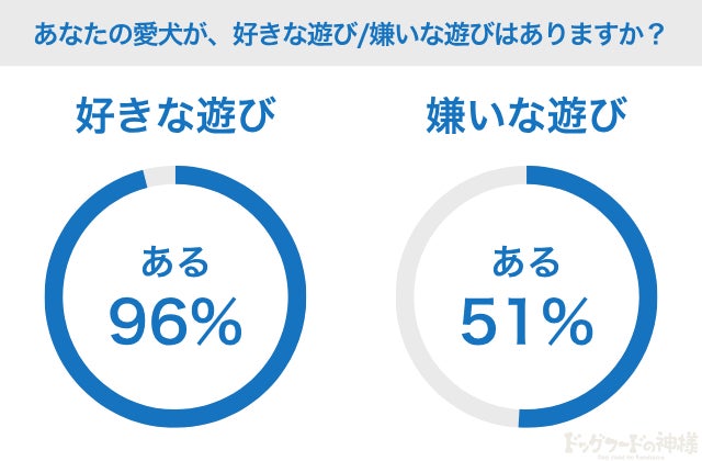 飼い主さん374名への調査では、96%が「うちのコには好きな遊びがある」と回答しました。やはりワンちゃんは遊びが大好きな存在。飼い主さんの多くが、その“遊びのツボ”をしっかり把握しているようです。