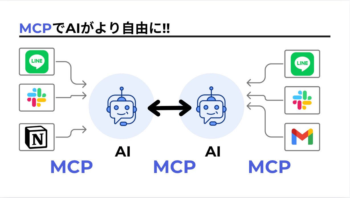 ※MCP(Model Context Protocol)とは、生成AIの基盤モデルClaudeで知られるAnthropic社が2024年11月に発表した規格。AIアプリケーションが外部のツールやデータを呼び出しやすくするための通信規格でAIアプリケーションのためのUSB Type-Cのようなものといわれています。