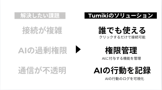 このような現状の中で、Tumiki MCPを活用することで、AIが社内情報を外部に漏洩したり、社内データベースを破壊することを防ぐことができるという解決手段を発表しました。