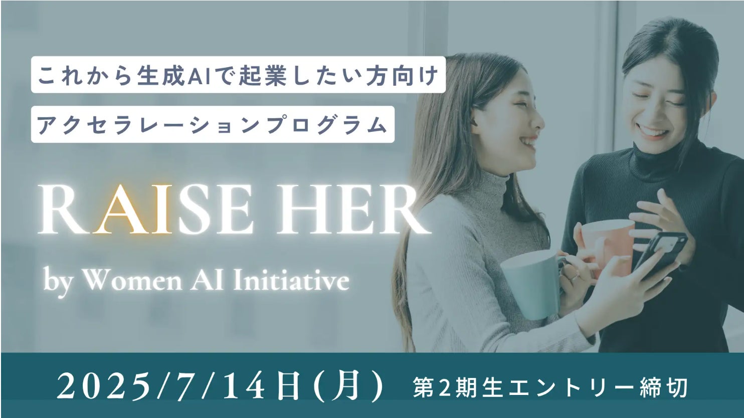 一般社団法人Women AI Initiative Japan(所在地:東京都渋谷区、代表理事:國本知里)は、起業を目指す女性のための実践型プログラム『RAISE HER(レイズ・ハー)』第2期の一部豪華講師陣を発表します。現在、全国から参加者のエントリーを受付中です。本プログラムは、生成AIを武器にゼロからビジネスを立ち上げる力を育成するアクセラレーションプログラムで、東京都のスタートアップ支援事業「TOKYO SUTEAM」と連携し実施しています。多様な経験と専門性を備えた講師が伴走し、起業家を目指す女性に新たな選択肢を提示します。