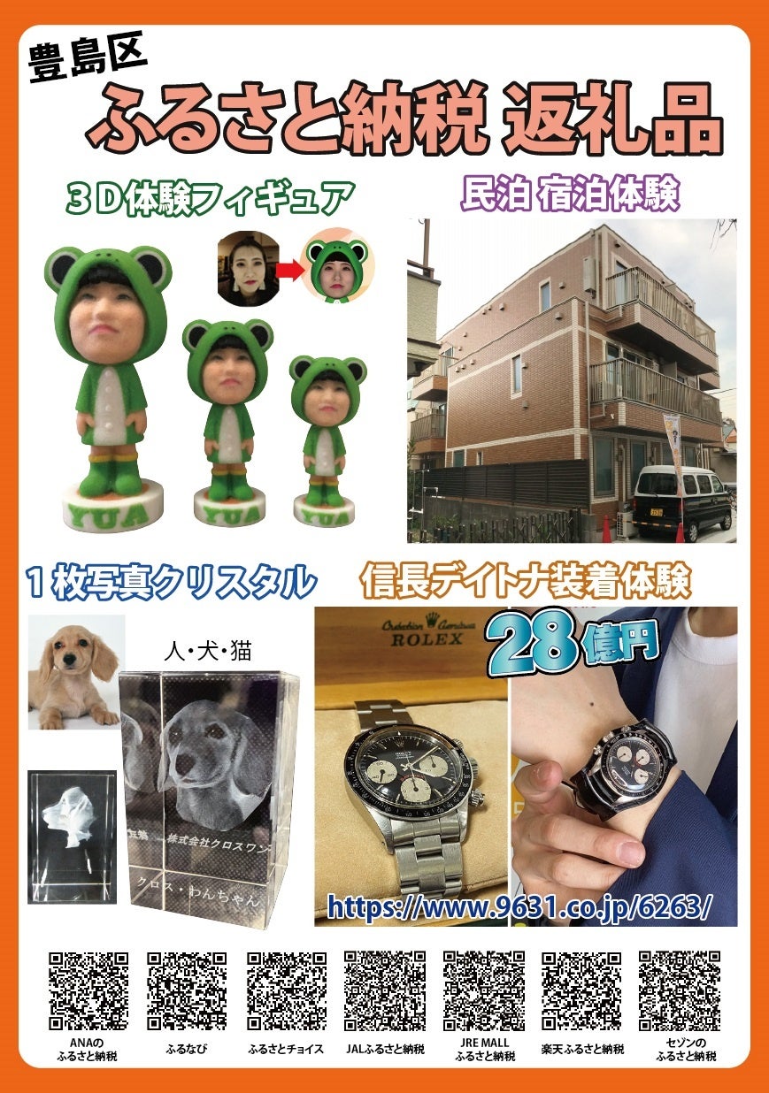 また、当グループは豊島区ふるさと納税の返礼品として、「高品質ポストカード」「3Dフィギュア・クリスタル体験」「民泊宿泊体験」「信長デイトナ装着体験」など、体験型返礼品を提供し、地域貢献と国際的文化交流の推進を図っています。
