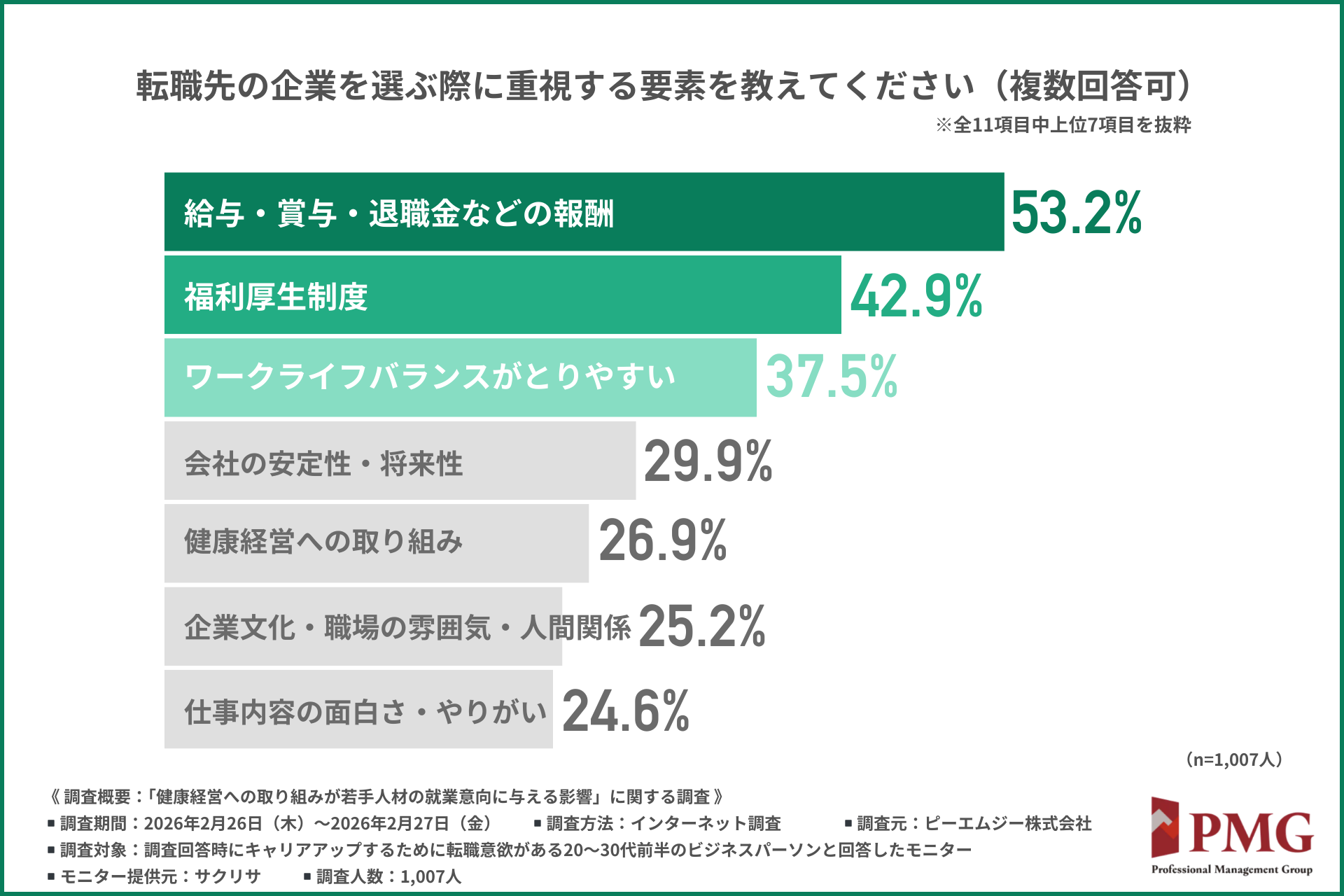 しかし、『健康経営への取り組み(従業員の健康維持・病気予防に関する施策)』も約3割となり、企業が従業員の健康をどうサポートしているかを、自身の生活を守りキャリアを築くための指標として評価し始めている様子がうかがえます。