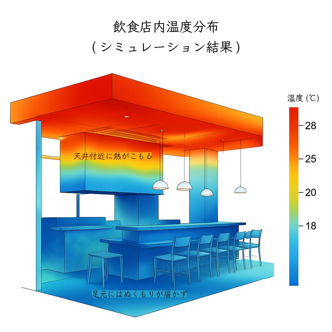 多くのAIシミュレーション結果では、冬季の飲食店やカウンター空間において「足元の冷え」が快適性を大きく損なっていることが分かっています。