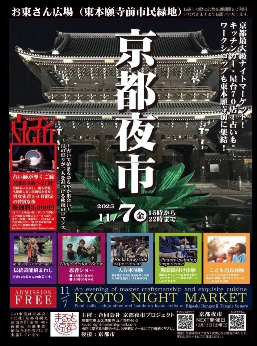 「夜の京都が、ほんまの京都」。京都の夜に文化と人のつながりを生み出す「京都夜市」(主催:合同会社京都夜市プロジェクト)は、2025年11月7日(木)に東本願寺前「お東さん広場」にて、第六回「京都夜市」を開催いたします。