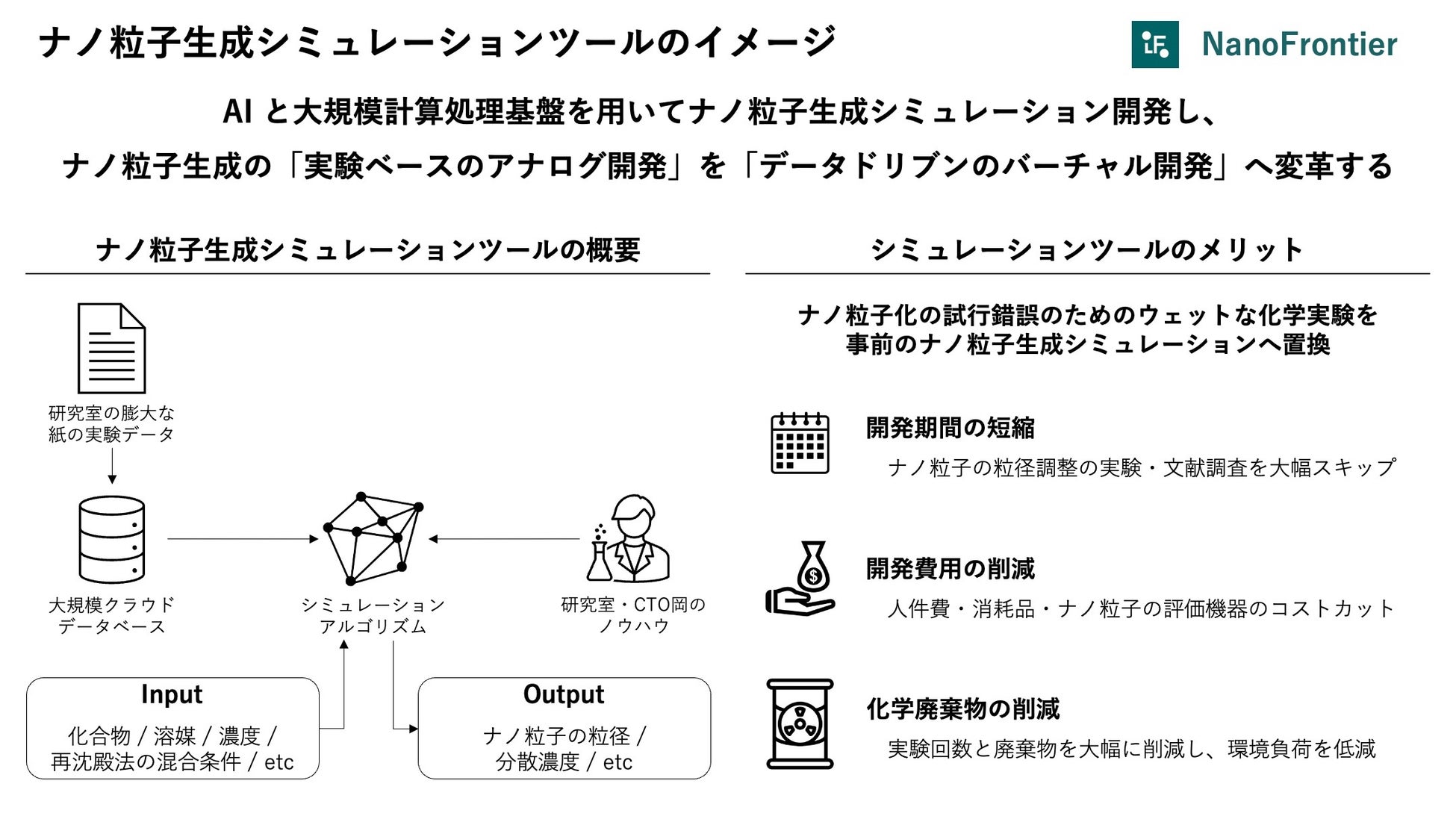 NanoFrontierは、有機材料をナノ粒子化して分散性や表面積を高め、感度や機能性を引き上げるコア技術を強みとしています。今回の採択を機に、ナノ粒子生成プロセスの設計空間をAIで探索し、粒径や分散状態などの条件最適化を高精度に予測するシミュレーション基盤を構築します。これにより、環境センシングやエネルギー、熱マネジメント、医療分野などで求められる高機能材料の創出を、限られた人だけが扱える高価で複雑な技術に依存せず、誰もがアクセスできる形で提供することを目指します。