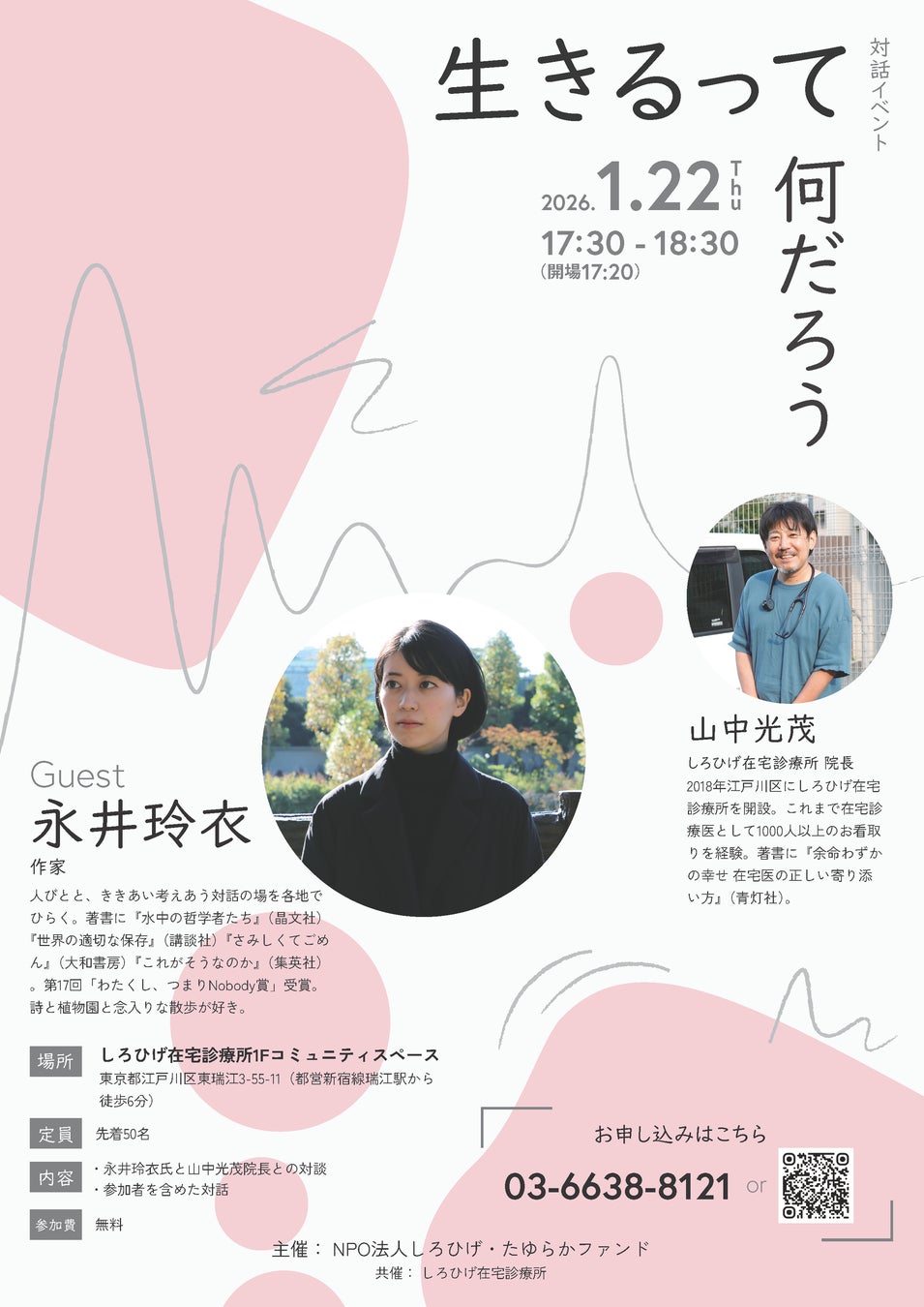 「NPO法人しろひげ・たゆらかファンド(本社所在地:東京都江戸川区、理事長:山中光茂、以下:当法人)」は、1月22日に永井玲衣氏×山中光茂の対話イベント「生きるってなんだろう」を開催いたします。当イベントでは、医師として日頃より人生の最期に寄り添っている「しろひげ在宅診療所」の院長 山中光茂が、作家として活躍する永井玲衣氏をお呼びし、「生きること」に対する想いや問いをみなさまに投げかけます。