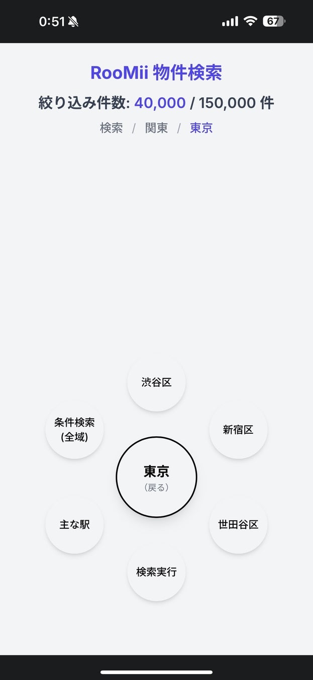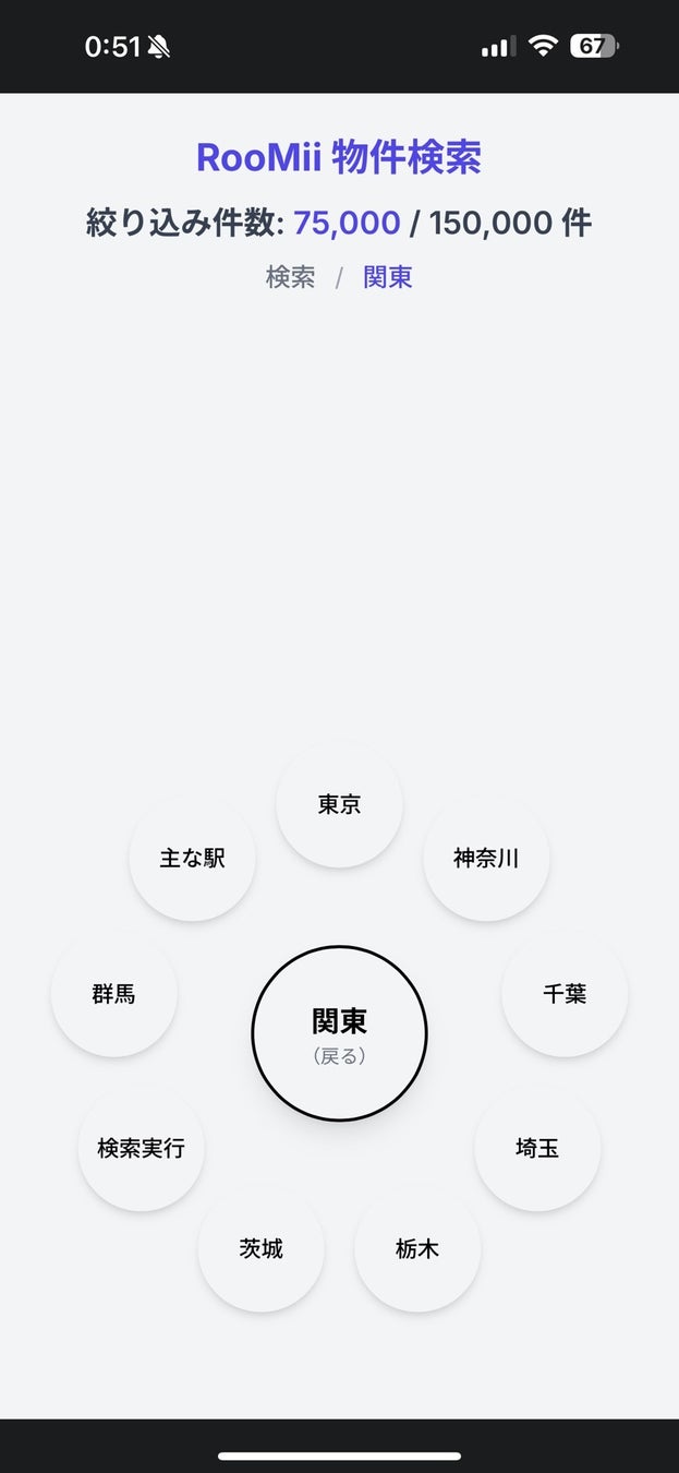 従来の不動産検索アプリでは、「エリア選択」→「路線・駅選択」→「価格帯」→「間取り」→「こだわり条件」と、縦長の画面を何度もスクロールしながら、多数のチェックボックスを一つ一つタップして選択する必要があります。 特にスマートフォンでは、画面の小ささも相まって操作が煩雑で非効率的でした。