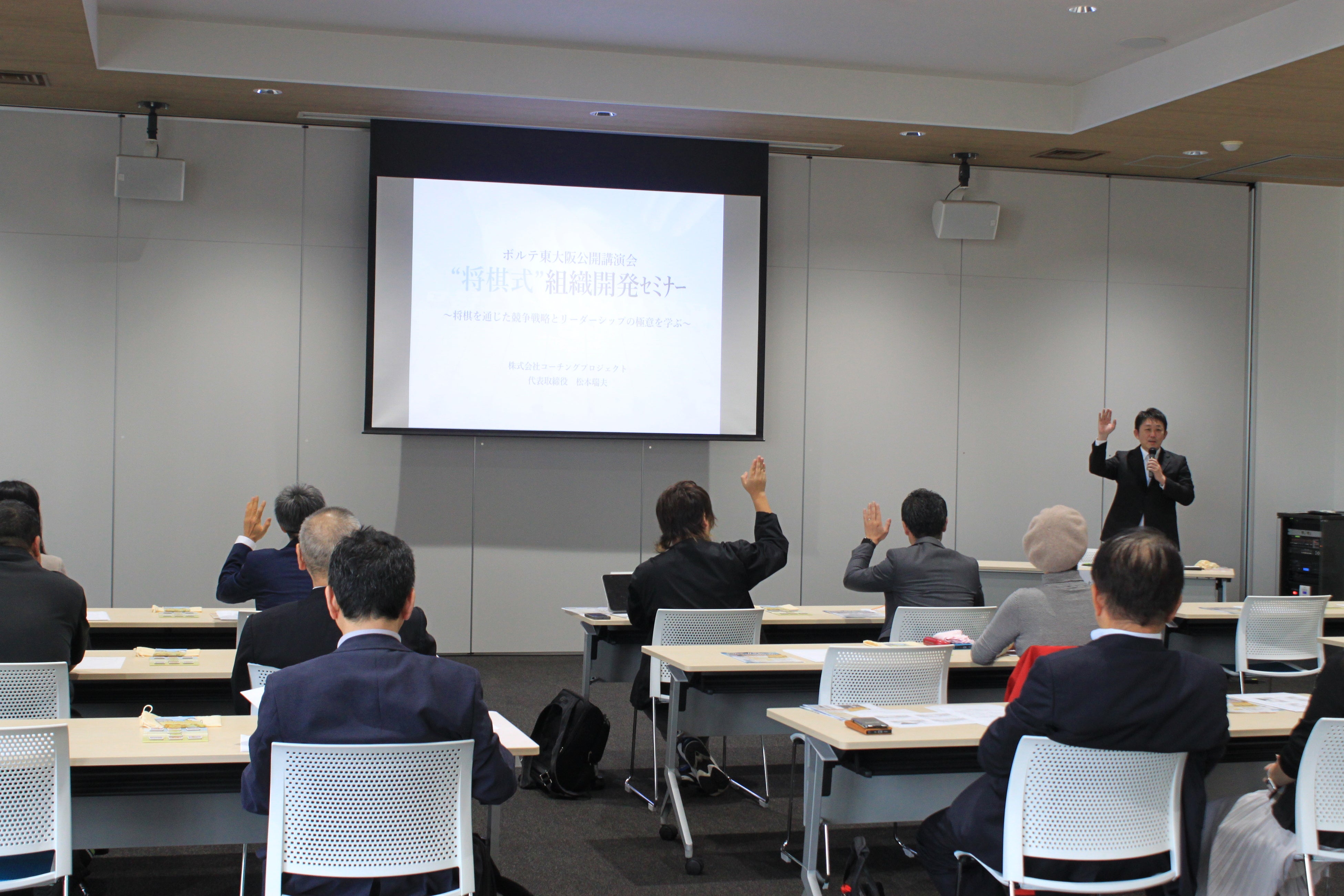 この組織課題に対する新しい解決策として『将棋式組織開発セミナー』を企画し、5月18日に高槻市で第1回を自主開催しました。将棋が初心者だったIT企業の経営者から、「将棋が、ここまでビジネスに密接につながるとは、まさに目から鱗でした」と評されるなど、大きな反響を呼びました。