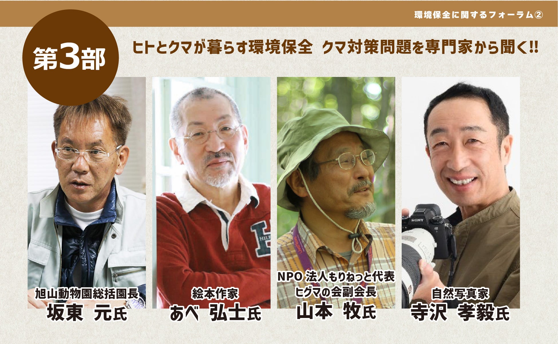 第3部は「ヒトとクマが暮らす環境保全」をテーマに、現場で起きていることを踏まえながら、私たちが知っておきたい論点を整理します。登壇は、坂東 元氏、あべ弘士氏、山本 牧氏、寺沢孝毅氏。進行は旭山動物園くらぶ理事長 森 禎宏が務めます。