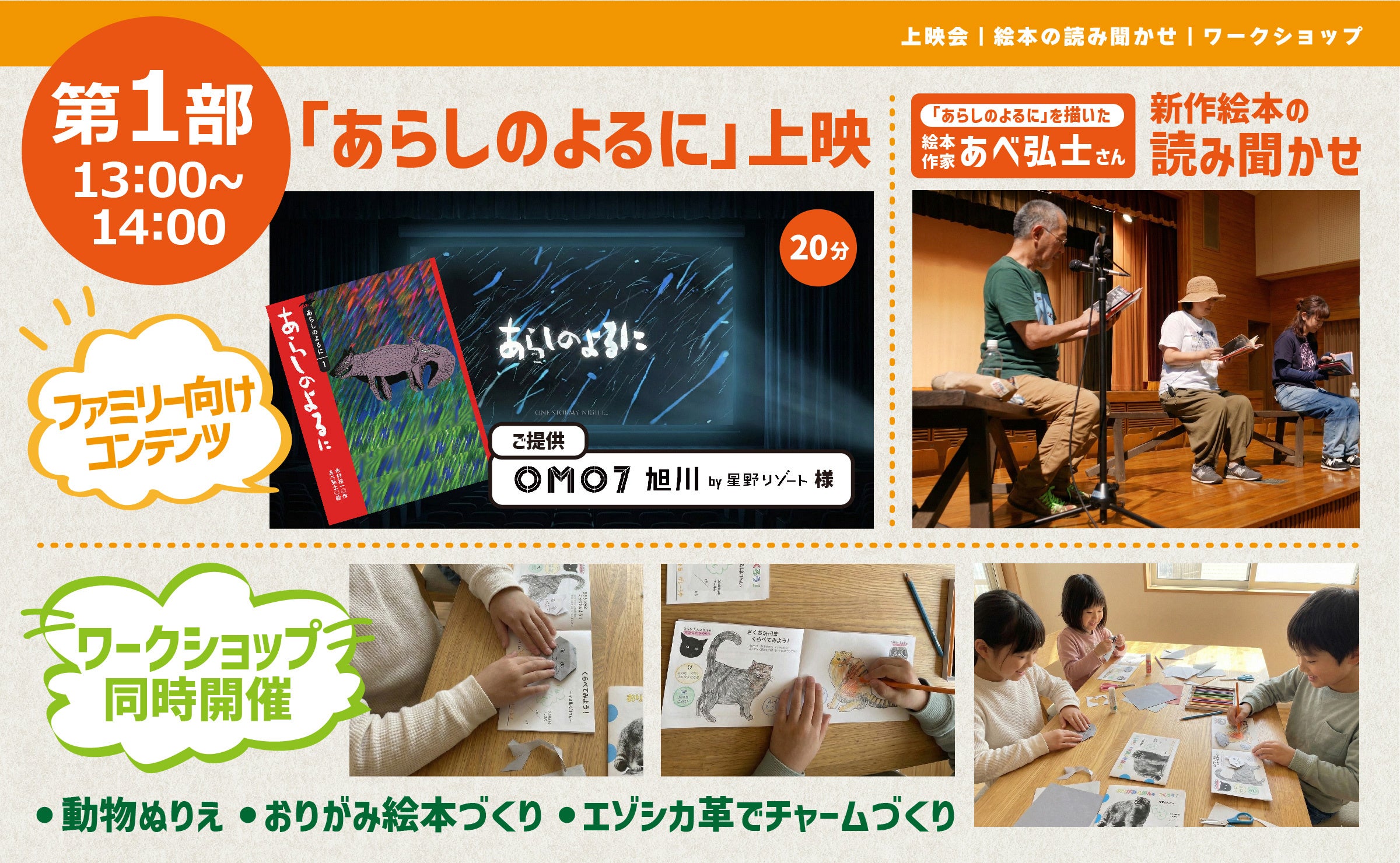 OMO7旭川提供の映像『あらしのよるに』上映(約20分)に続き、絵本作家のあべ 弘士さんによる新作絵本の読み聞かせを行います。