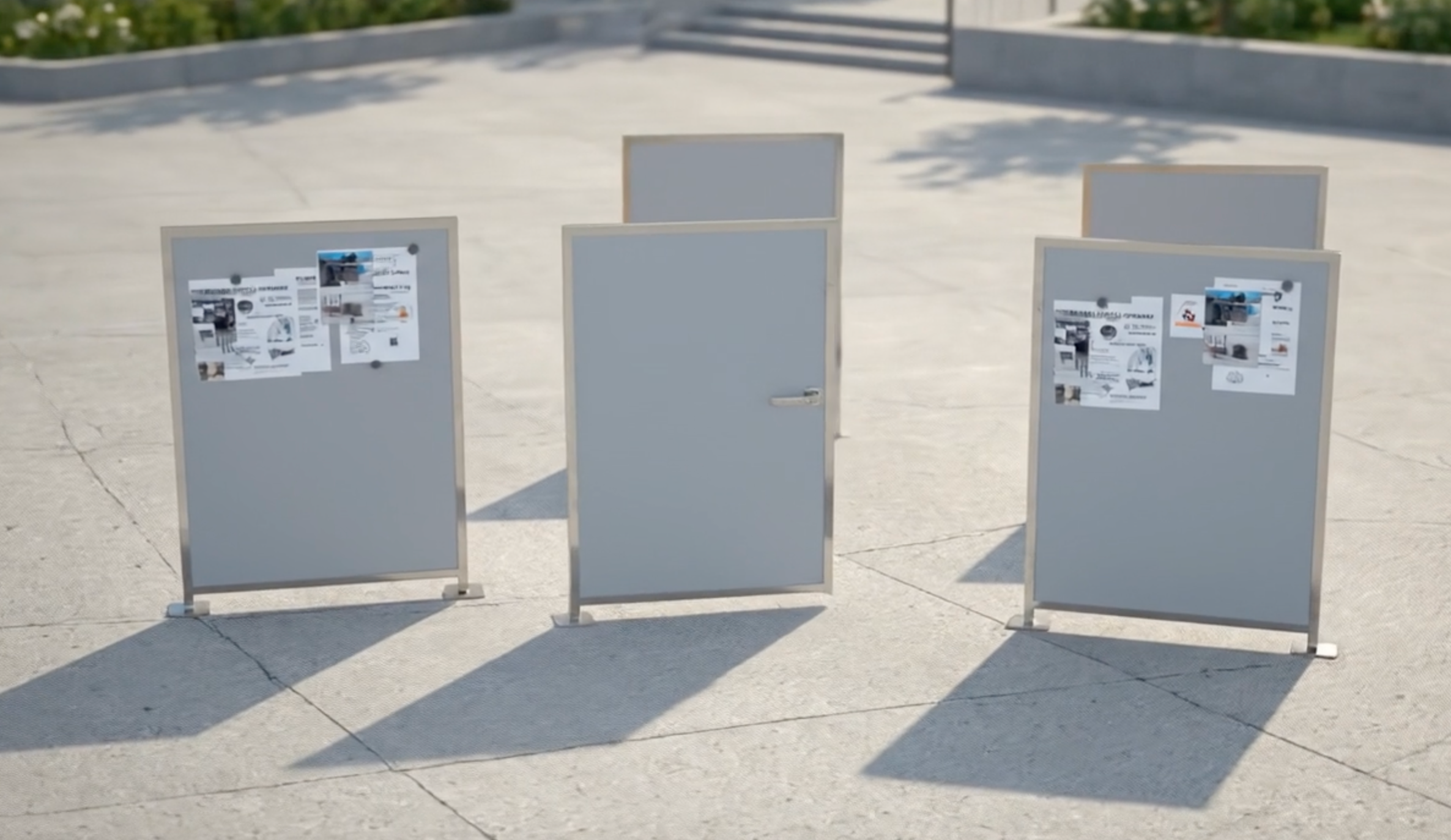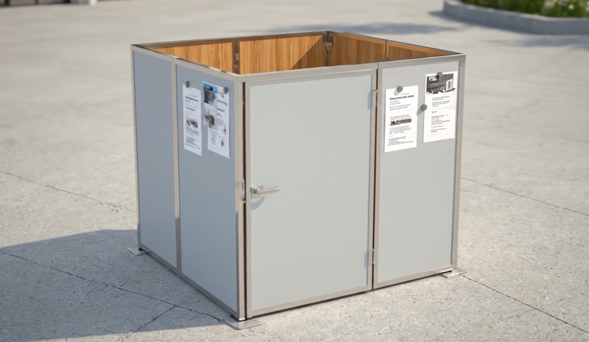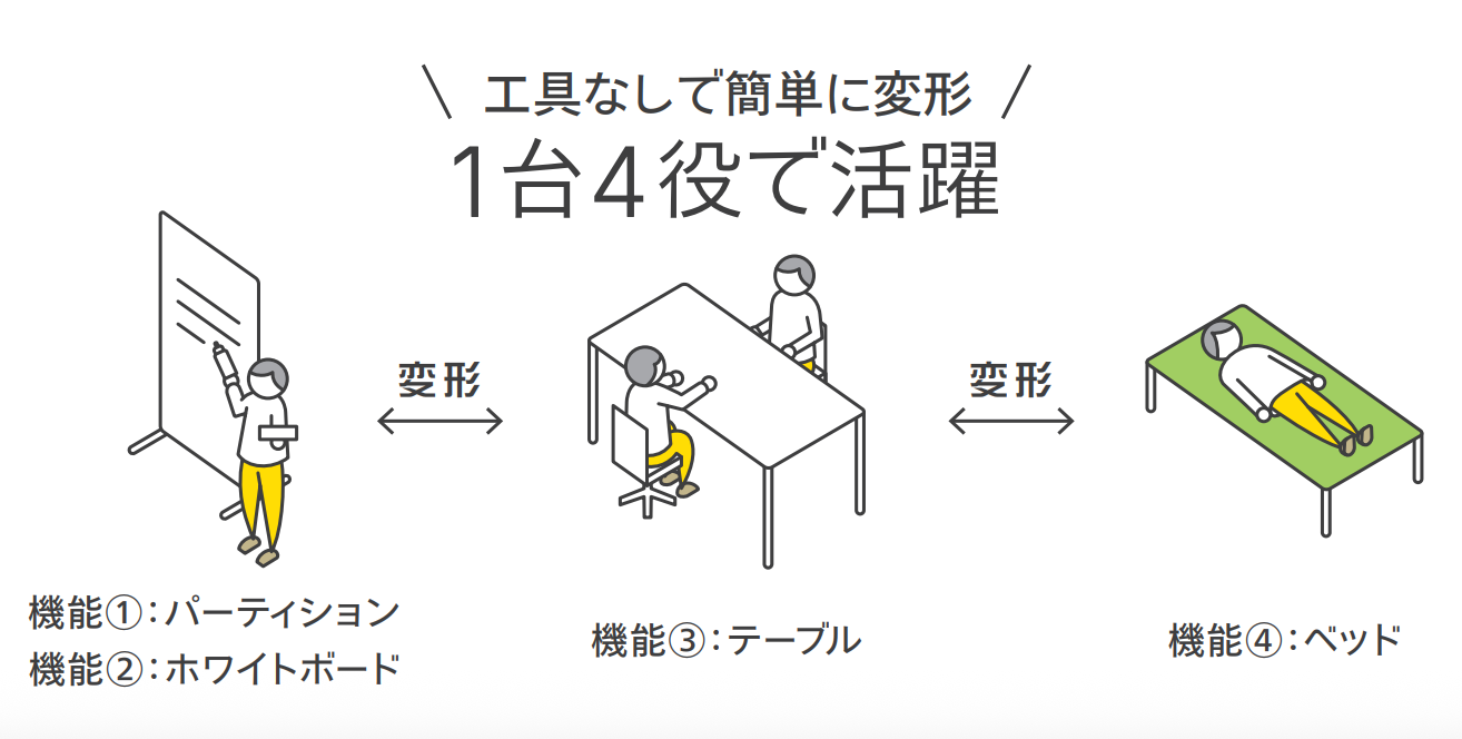 工具不要で組み替え可能な設計により、平時は、パーティションやホワイトボード、打ち合わせ用テーブルとして活用しながら、災害時には即座に避難所設備として、ベッドや食事をするためのテーブル、緊急連絡に必要なホワイトボードとして使用できます。