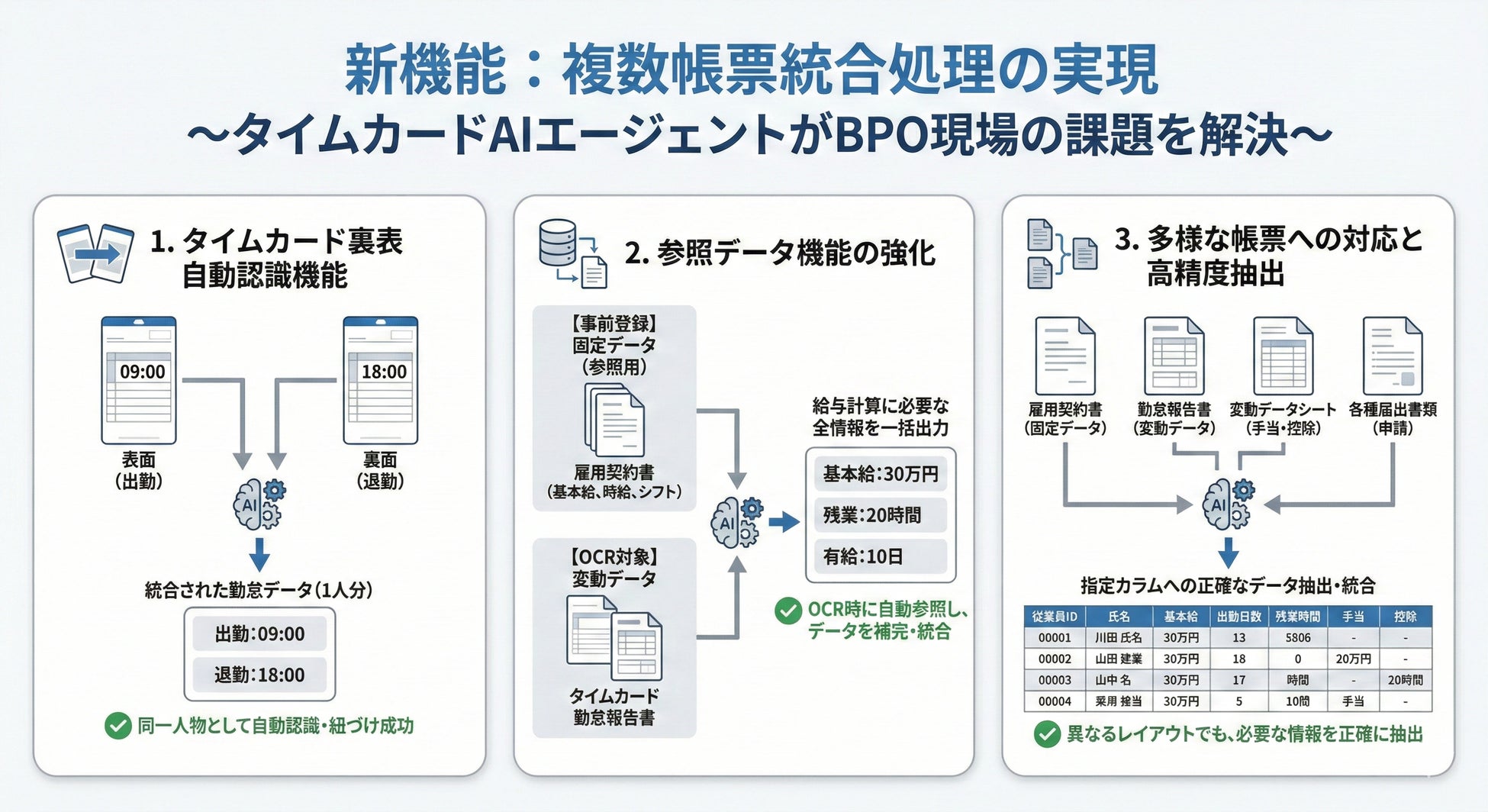 「タイムカードAIエージェント」が複数帳票の統合読み取りに対応〜 タイムカードの裏表、固定データ・変動データの一括処理で、BPO現場の業務効率を飛躍的に向上