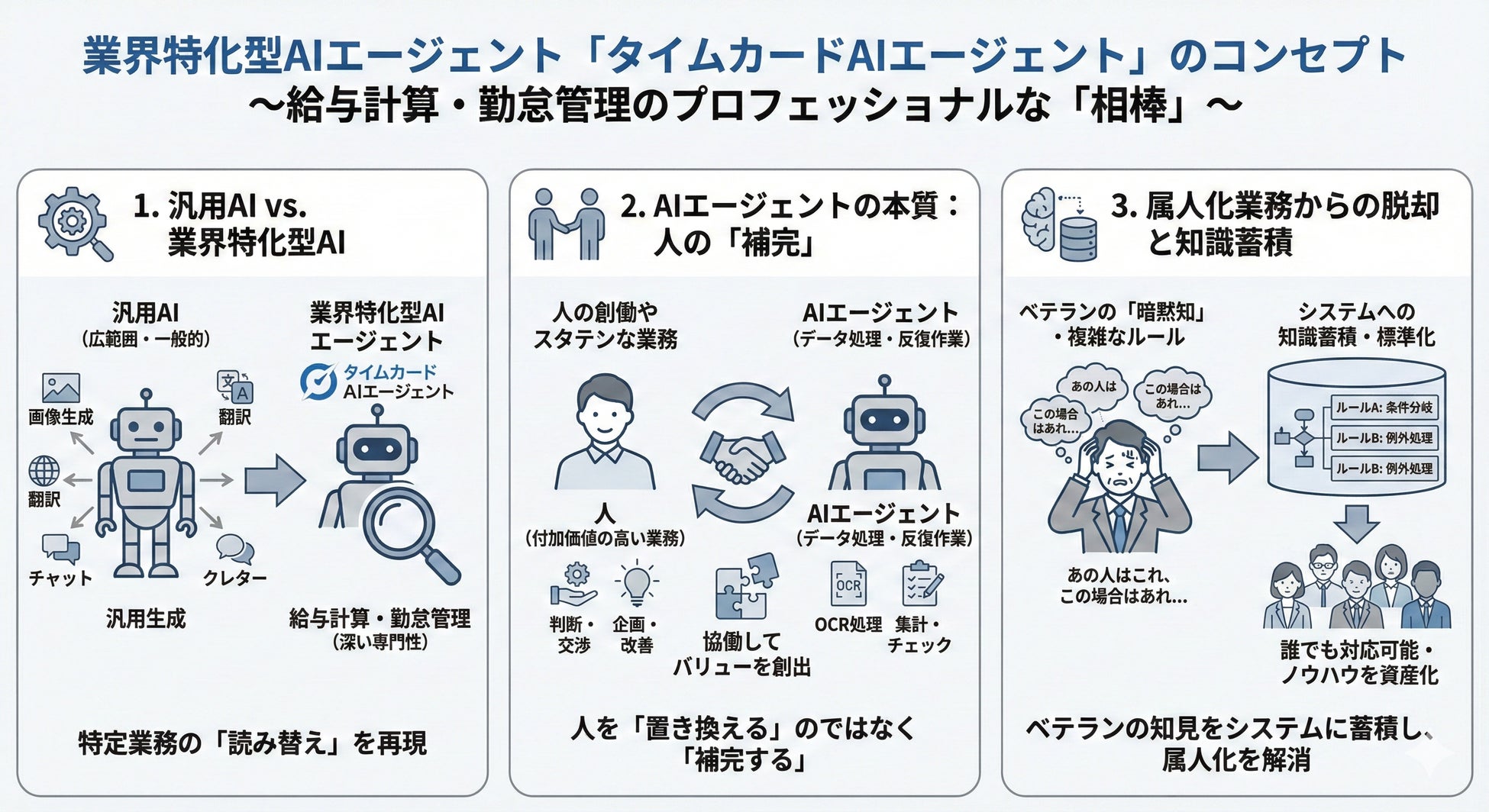 「タイムカードAIエージェント」は、給与計算・勤怠管理という特定領域において、人間の「読み替え」作業を再現する特化型のAIエージェントです。
